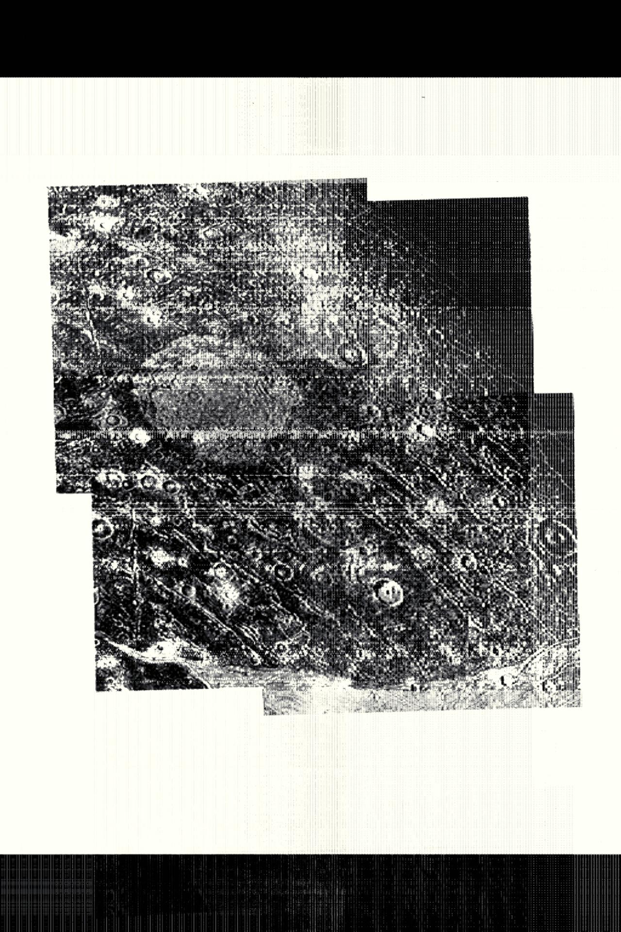 Range : 85,000 kilometers (53,000 miles) This photo of Jupiter's satellite Ganymede shows ancient cratered terrain. A variety of impact craters of different ages are shown. The brightest craters are the youngest. The ejecta blankets fade with age. The center shows a bright patch that represents the rebounding of the floor of the crater. The dirty ice has lost all topography except for faint circular patterns. Also shown are the 'Callisto type' curved troughs and ridges that mark an ancient enormous impact basin. The basin itself has been destroyed by later geologic processes. Only the ring features are preserved on the ancient surface. Near the bottom of the picture, these curved features are trumcated by the younger grooved terrain.