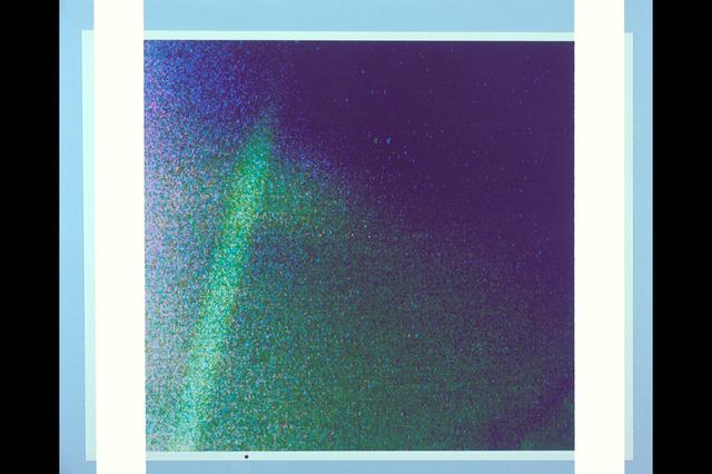 P-21763 C Range: 1,400,000 kilometers (870,000 miles) Jupiter's thin ring of particles was photographed by Voyager 2's telescope-equipped TV camera through three color filters to provide this color representation. During the three long exposures the spacecraft drifted, smearing out the ring image. The linear feature just above the ring is a star trail. True color of the ring cannot be deduced from this photo.