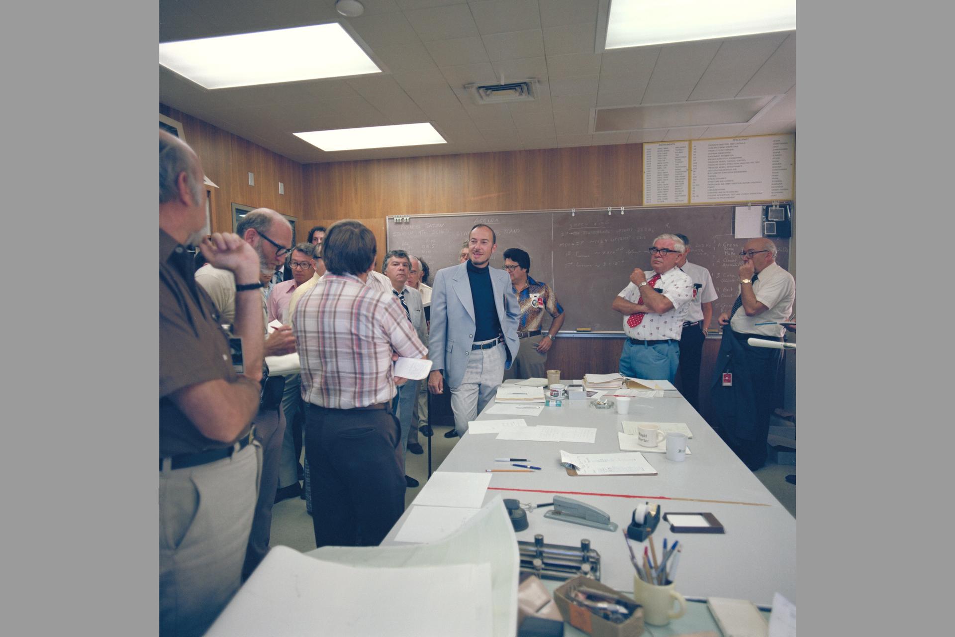 Pioneer Saturn: Charlie Hall, project manager daily stand up meeting shown are John Wolfe, Charlie Hall, Sy Syvertson and Richard Fimmel in bkgrd