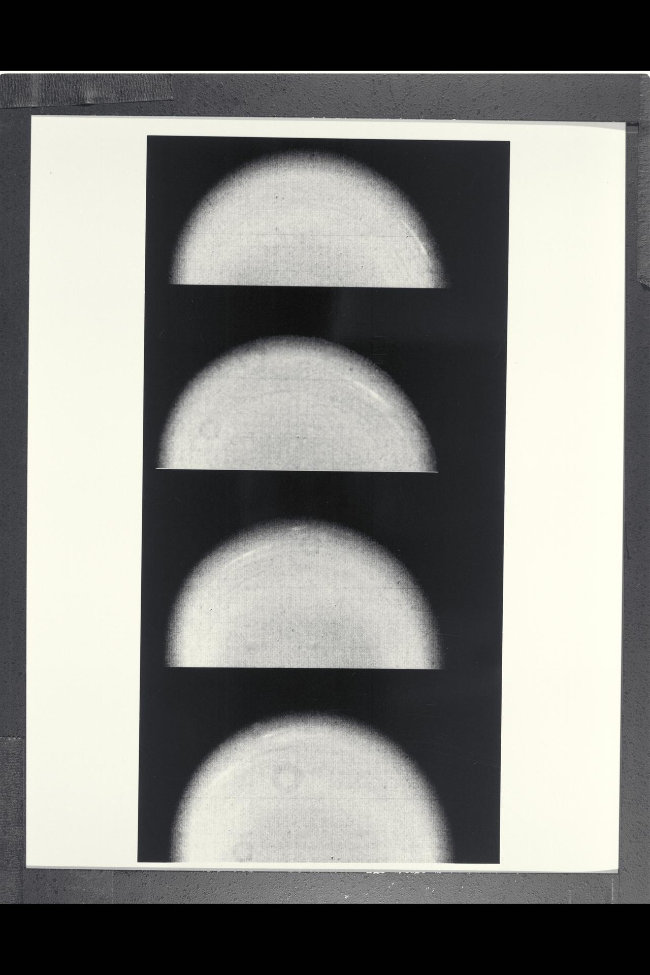 Range : 12.9 million km. ( 8.0 million miles ) P-29467B/W Time lapse Voyager 2 images of Uranus show the movement of two small, bright, streaky clouds, the first such features ever seen on the planet. The clouds were detected in this series of orange filtered images, over a 4.6 hour interval ( from top to bottom ). Uranus, which is tipped on its side with respect to the other planets, is rotating in a counter-clockwise direction, with its pole of rotation near the center of the disk, as are the two clouds seen here as bright streaks. The larger of the two clouds is ata lattitude of 33 degrees. The smaller cloud, seen faintly in the three lower images, lies at 26 degrees ( a lower alttitude and hence closer to the limb). Their counterclockwise periods of rotation are 16.2 and 16.9 hours, respectively. This difference implies that the lower lattitude feature is lagging behind the higher latitude feture at a speed of almost 100 meters pers second (220 mph). Latitudinal bands are also visible in these images, the faint bands, more numerous now then in previous Voyager images from longer range, are concentric with the pole rotation. thatis, they circle the planet in lines of contant latitude.