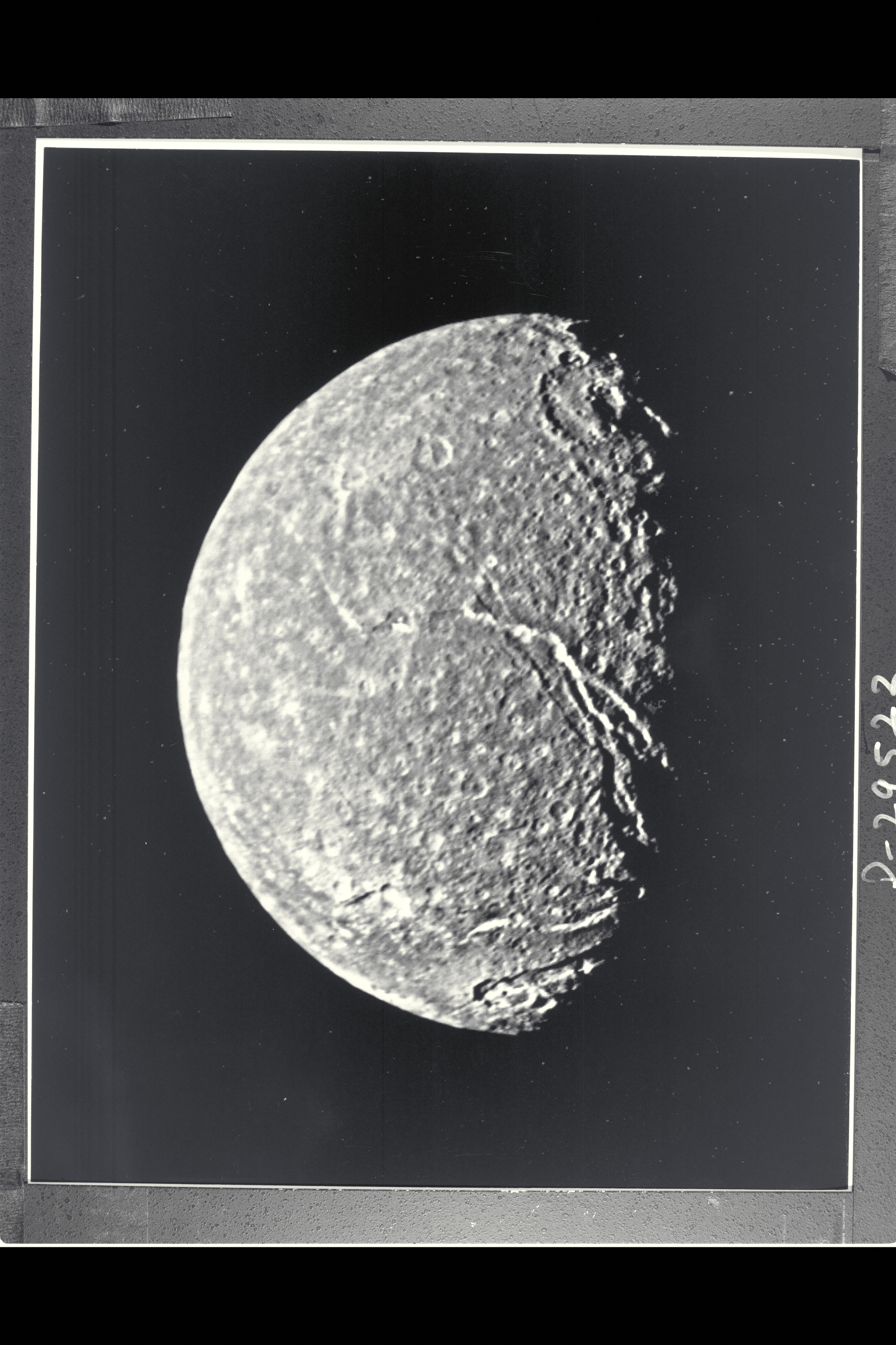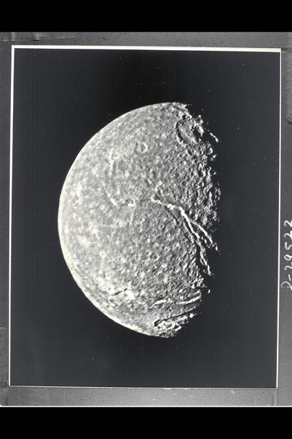 P-29522BW Range: 369,000 kilometers (229,000 miles) This is the highest-resolution picture of Titania returned by Voyager 2. The picture is a composite of two images taken through the clear-filter of Voyager's narrow-angle camera. The resolution of this image is 13 km (8 mi). Titania is the largest satellite of Uranus, with a diameter of little more than 1,600 km (1,000 mi). Abundant impact craters of many sizes pockmark the ancient surface. The most prominant features are fault valleys that stretch across Titania. They are up to 1,500 km (nearly 1,000 mi) long and as much as 75 km (45 mi) wide. In valleys seen at right center, the sunward-facing walls are very bright. While this is due partly to the lighting angle, the brightness also indicates the presence of a lighter material, possibly young frost deposits. An impact crater more than 200 km (125 mi) in diameter distinguishes the very bottom of the disk; the crater is cut by a younger fault valley more than 100 km (60 mi) wide. An even larger impact crater, perhaps 300 km (180 mi) across, is visible at top.