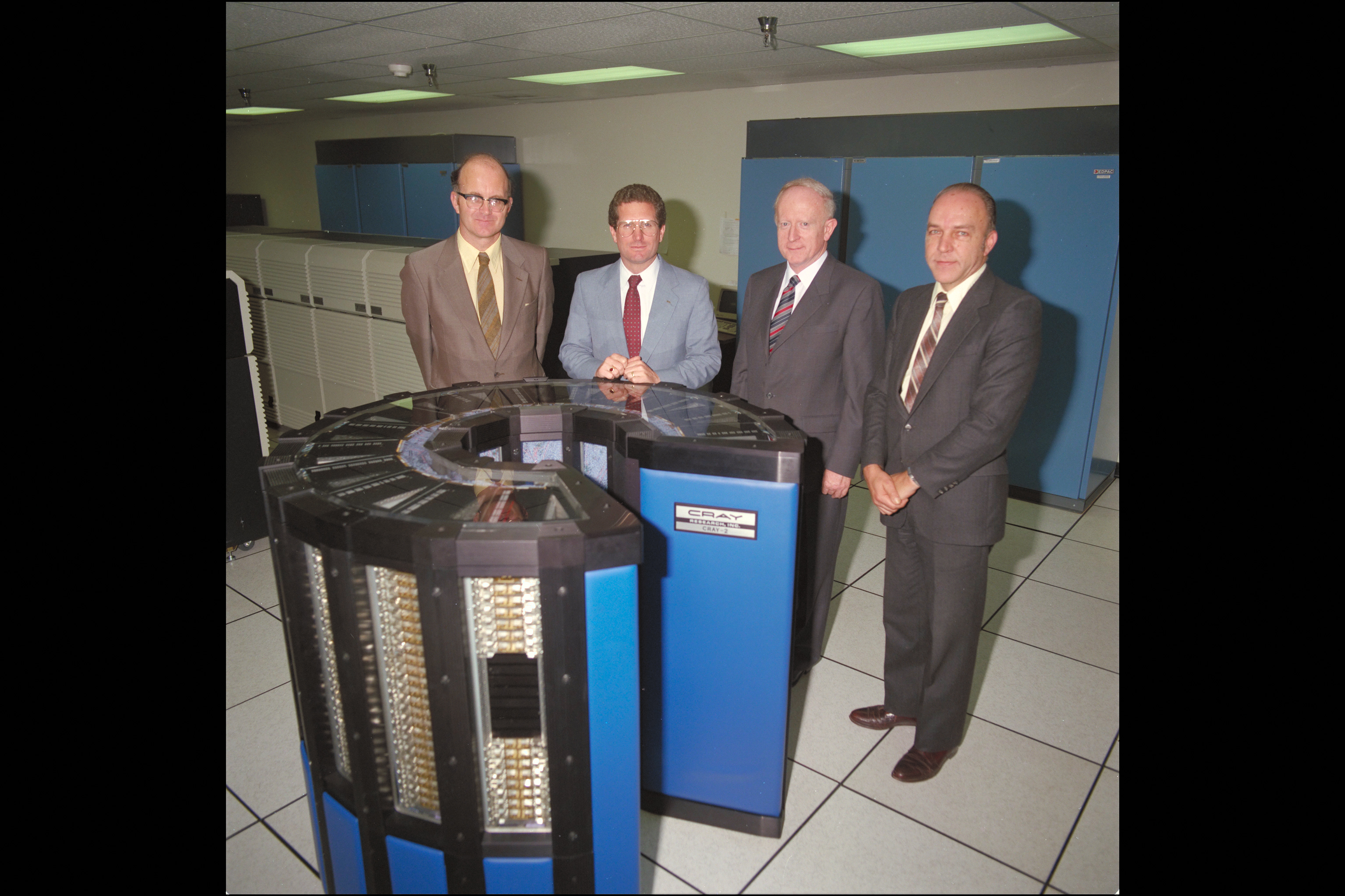Ames Director William 'Bill' Ballhaus (center left) joins visitor Sir Jeffrey Pope from Royla Aircraft Industry, England (center right) at the NAS Facility Cray 2 computer with Ron Deiss, NAS Deputy Manager (L) and Vic Peterson, Ames Deputy Director (R).