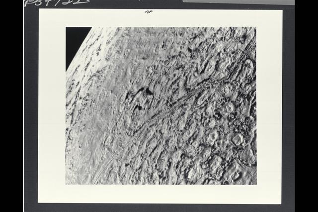 Voyager II Imagery, Neptune: This is one of the most detailed views of the surface of Triton taken by Voyager 2 on its flyby of the large satellite of Neptune early in the morning of August 25, 1989. The picture was stored on the tape recorder and relayed to Earth later. Taken from a distanT ce of only 40,000 km (25, 000 miles), the frame is about 220 kilometers (140 miles) across and shows details as small as 750 meters (0.5 miles). Most of the area is covered by a peculiar landscape of roughly circular depressions separated by rugged ridges. This type of terrain, which covers large tracts of Triton's northern hemisphere, is unlike anything seen elsewhere in the solar system. The depressions are probably not impact craters: They are too similar in size and too regularly spaced. Their origin is still unknown, but may involve local melting and collapse of the icy surface. A conspicuous set of grooves and ridges cuts across the landscape, indicating fracturing and deformation of Triton's surface. The rarity of impact craters suggests a young surface by solar-system standards, probably less than a few billion years old. The Voyager Mission is conducted by JPL for NASA's Office of Space Science and Applications. (JPL ref: P-34722 Voyager N-60 )