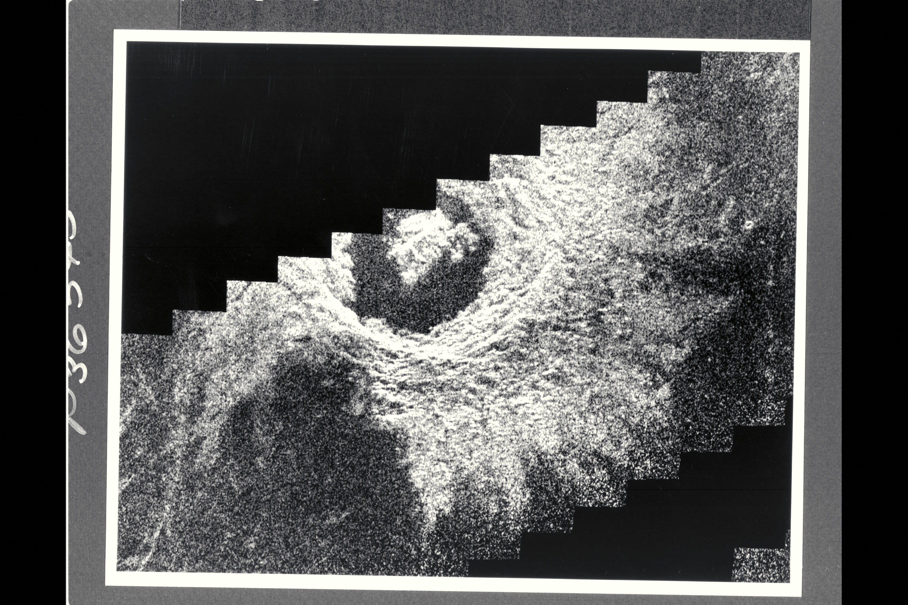 This Magellan image mosaic shows the impact crater Golubkina, first identified in Soviet Venera 15/16 data. The crater is names after Anna Golubkina (1864-1927), a Soviet sculptor. The crater is about 34 km (20.4 mi.) across, similar to the size of the West Clearwater impact structure in Canada. The crater Golubkina is located at about 60.5 degrees north latitude, 286.7 degrees est longitude. Magellan data reveal that Golubkina has many characteristics typical of craters formed by a mereorite impact including terraced inner walls, a central peak, and radar-bright rough ejecta surrounding the crater. The extreme darkness of the crater floor indicates a smooth surface, perhaps formed by the ponding of lava flows in the crater floor as seen in may lunar impact craters. The radar-bright ejecta surrounding the crater indicates a relatively fresh or young crater. Craters with centeral peaks in the Soviet data range in size from about 10-60 km (6-36 mi.) across. The largest crater identifed in the Soviet Venera data is 140 km (84 mi) in diameter. This Magellan image strip in approx. 100 km (62 mi.) long. The image is a mosaic of two orbits obtained in the first Magellan radar test and played back to Earth to the Deep Space Network stations near Goldstone, CA and Canberra, Australia, respectively. The resolution of this image is approximately 120 meters (400 feet). The see-saw margins result from the offset of individual radar frames obtained along the orbit. The spacecraft moved from the north (top) to the south, looking to the left.