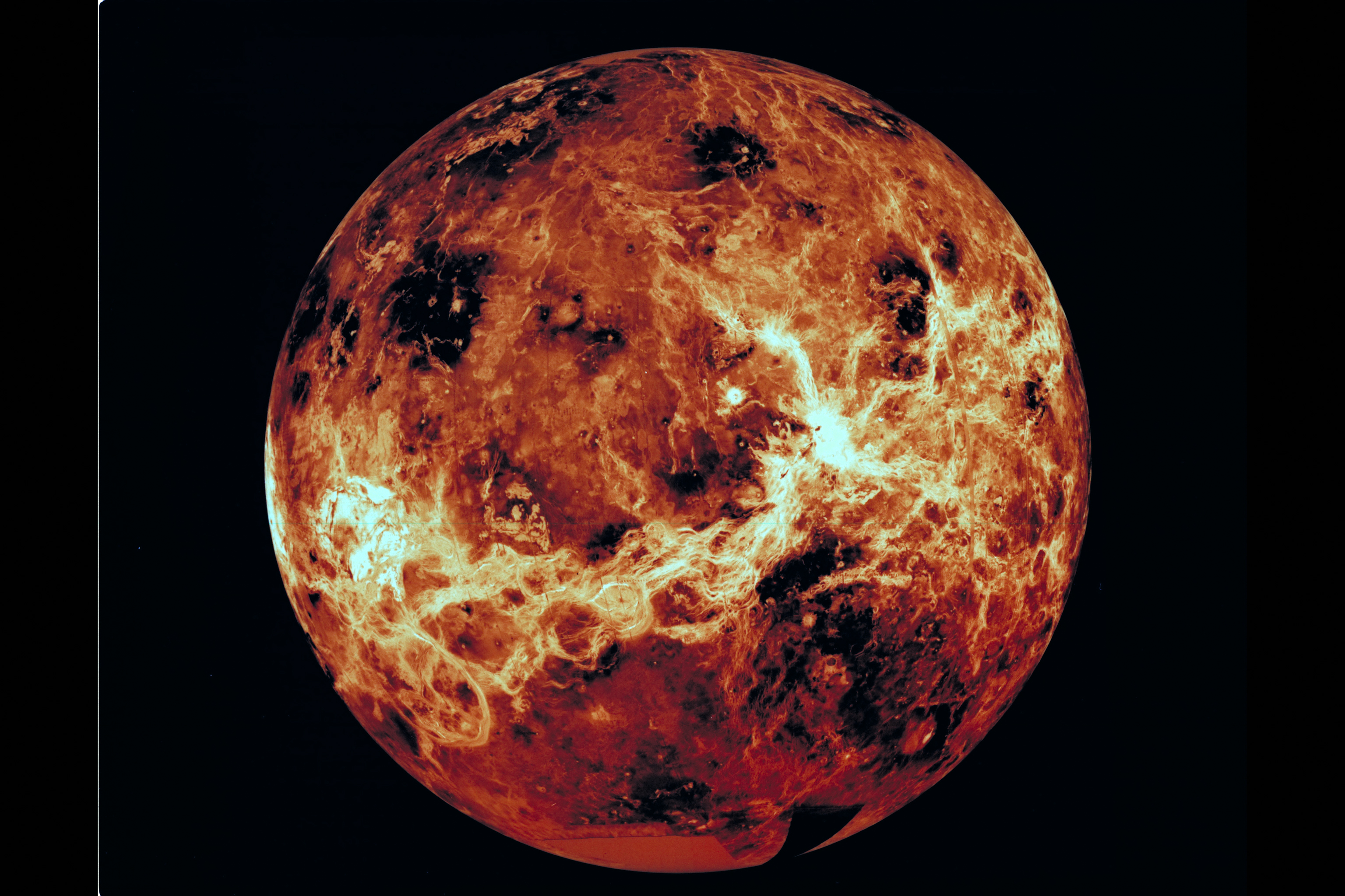 This global view of the surface of Venus is centered at 270 degrees east longitude. Magellan synthetic aperture radar mosaics from the first cycle of Magellan mapping are mapped onto a computer-simulated globe to create this image. Data gaps are filled with Pioneer-Venus orbiter data, or a constant mid-range value. Simulated color is used to inhance small-scale structure. The simulated hues are based on color images recorded by the Soviet Venera 13 and 14 spacecraft.