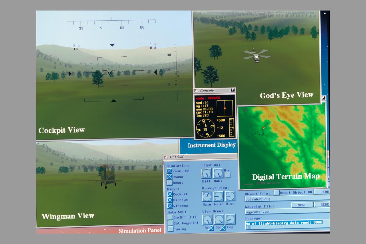 HELSIM: Helicopter Simulation simulation panel showin composite images of cockpit, wingman, God's eye views, digital terrain Map and instrument panel