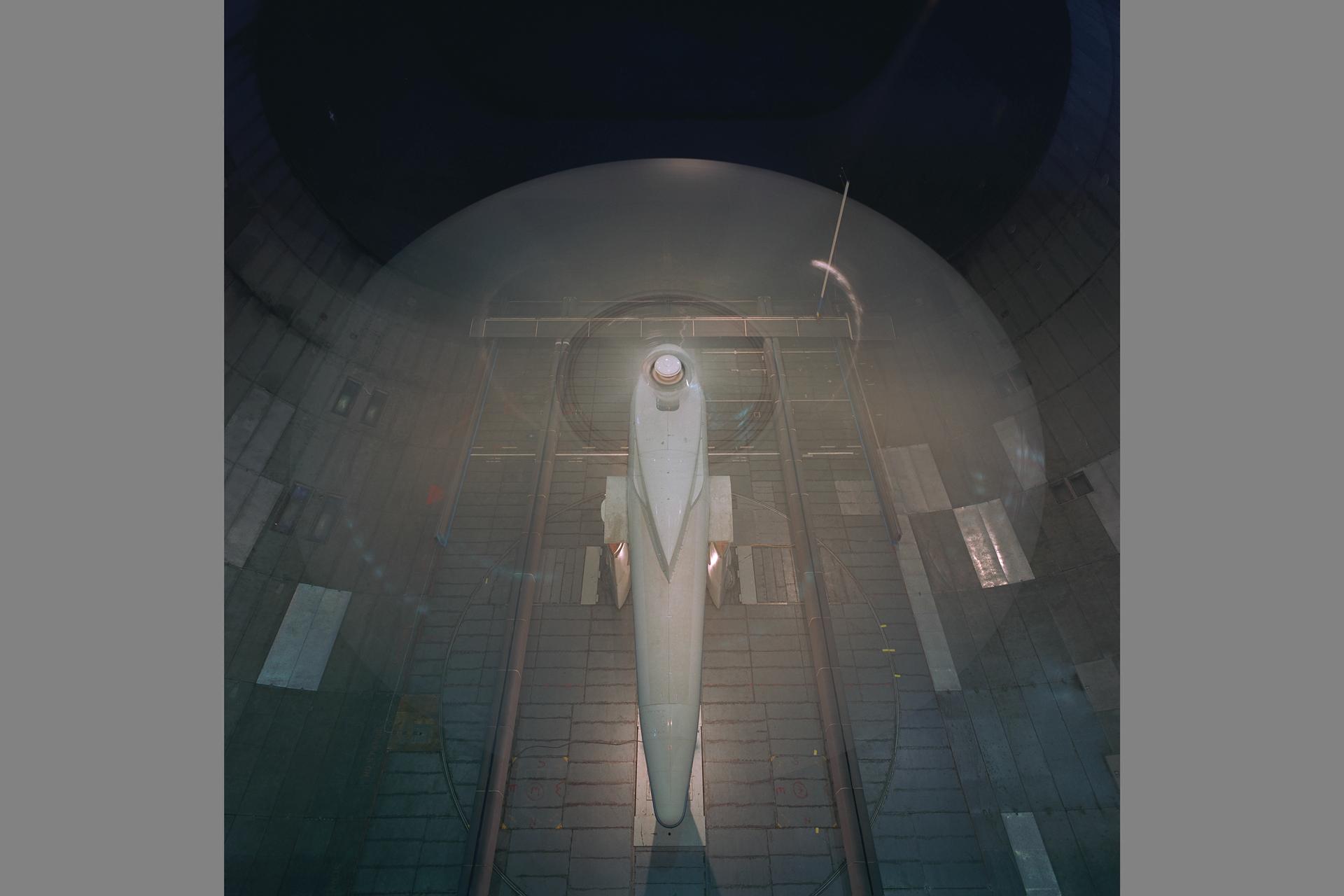 Sikorsky Bearingless Main rotor (SBMR) mounted on the Ames Rotor Test Apparatus (RTA) during testing in the NASA Ames 40x80ft Subsonic Wind Tunnel, test-584. Rotors in motion.