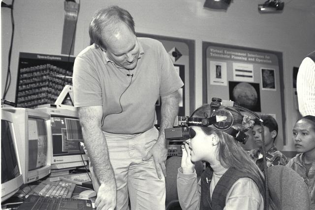 'Life from other Worlds' with McNair Middle School TROV robot explores under Antarctic ice - image during demo Ames reseacher Bob Hine leads students operating TROV