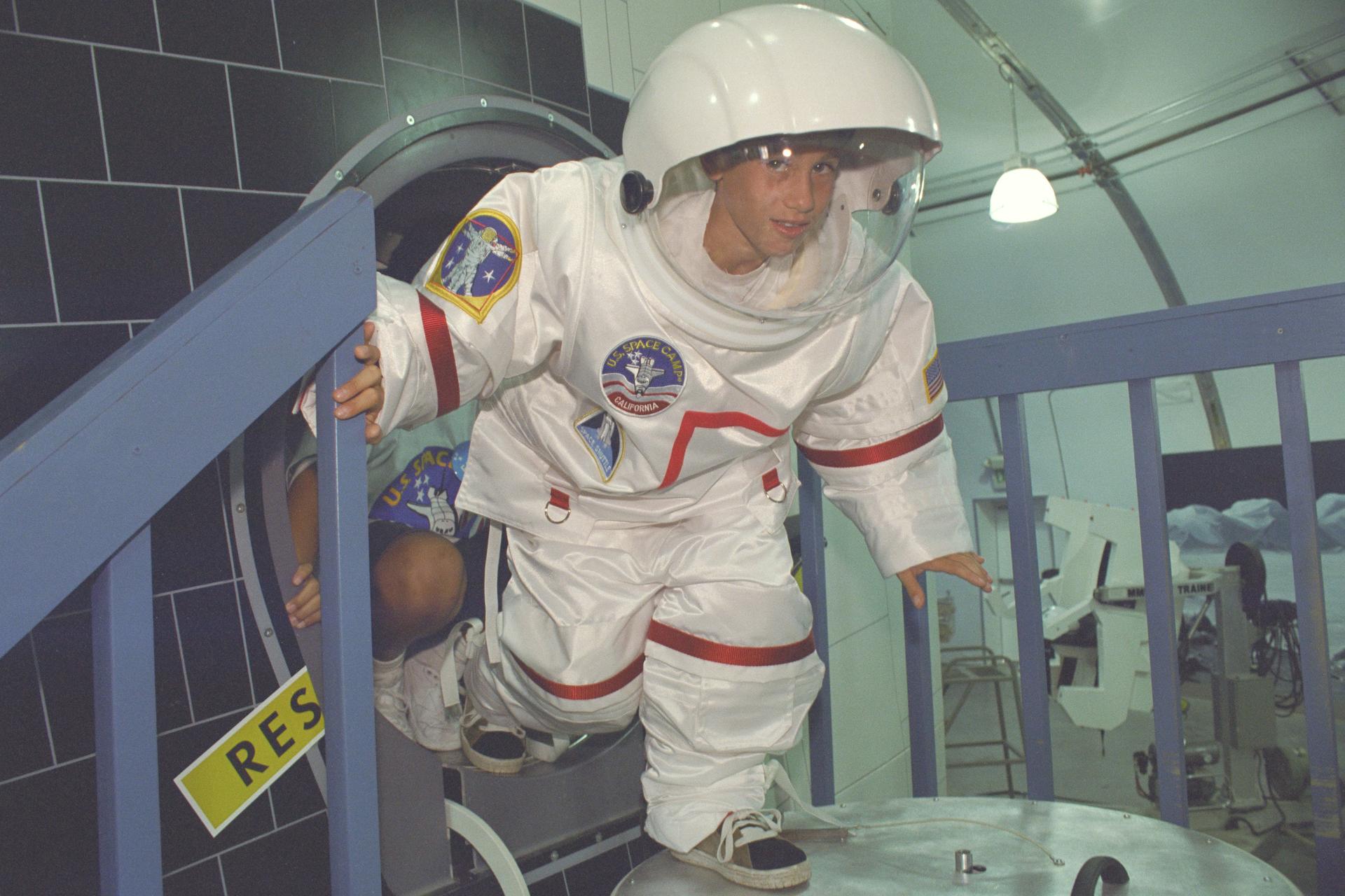 U.S. Space Camp California 'Day Camp' Grand Opening - student tries out space suit and shuttle mockup