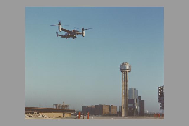 XV-15 Tiltrotor in hover helicopter flight at Bell Helicopter Co. Bell Photo number 043901 (credit and permission required from Bell Helicopter Company for any non-governmental reproductions)