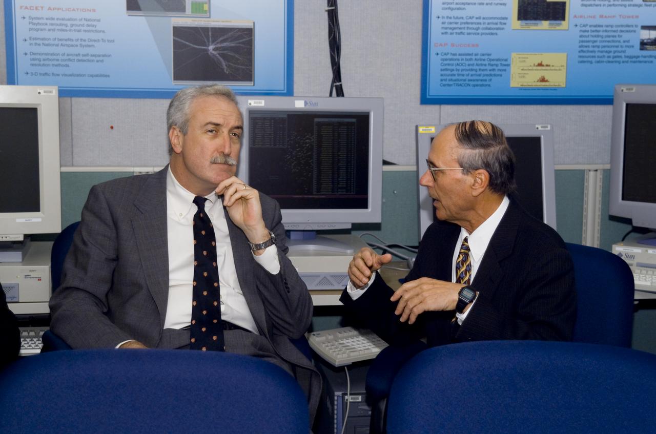 NASA Director Sean O'Keefe comes to Ames for employee briefing and tour. On tour in ATC labs , briefing by Dr. Heinz Erzberger