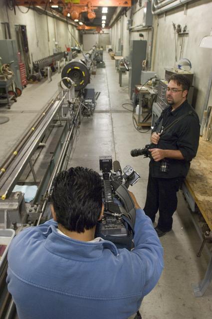 Ames holds a Media Day at the Hypervelocity Free Flight facility where Ames is conducting high-speed tests of small models of the agency's new Orion CEV to learn about stability during flight. The hypervelocity test facility uses a gun to shoot Orion models between 0.5 and l.5 inches (1.25 - 3.75 centimeters in diameter. The facility can conduct experiments with speeds up to 19,000 miles per hour (30,400 kilometers per hour) - Cesar Acosta, NASA photographer in forground and a news camera men taking shot of the gun facility
