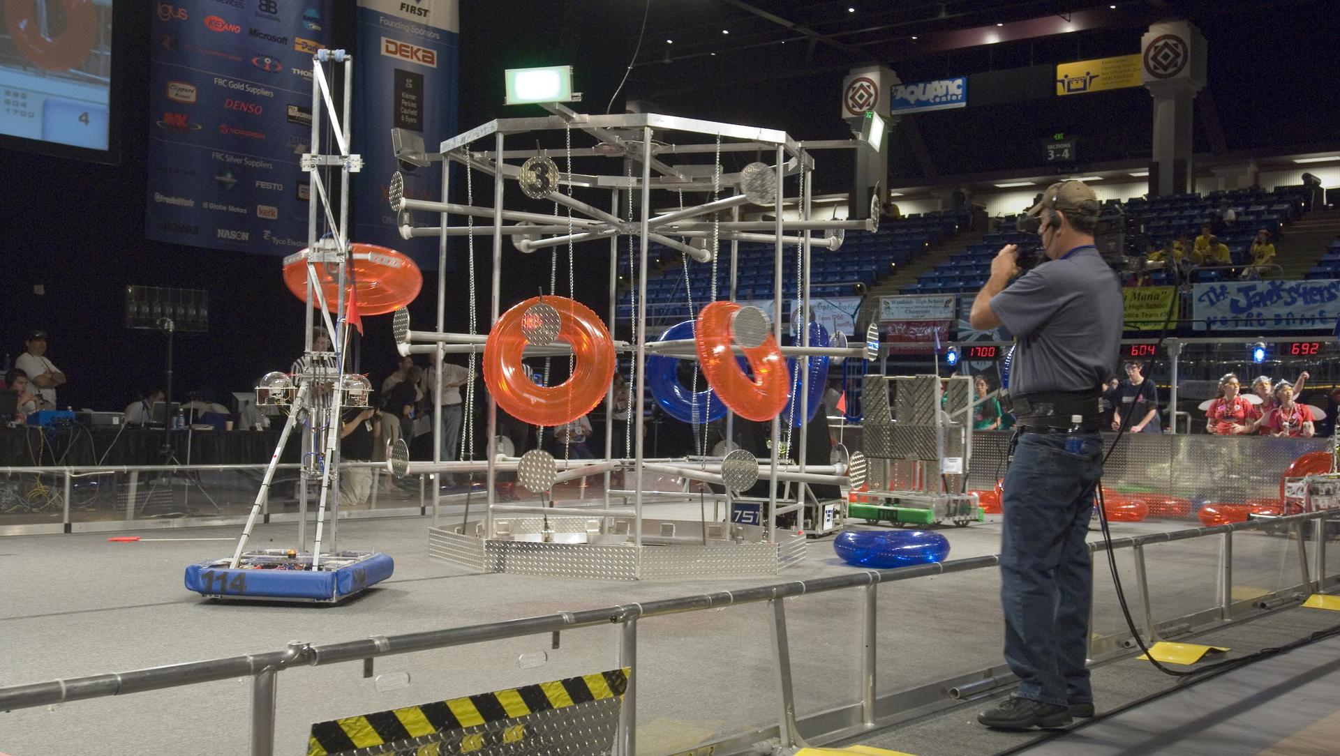 Silicon Valley FIRST Regional Robotics competition: Eagle Srike - Team 114 - Los Alton High School, Los Altos, California (CA) on floor doing battle