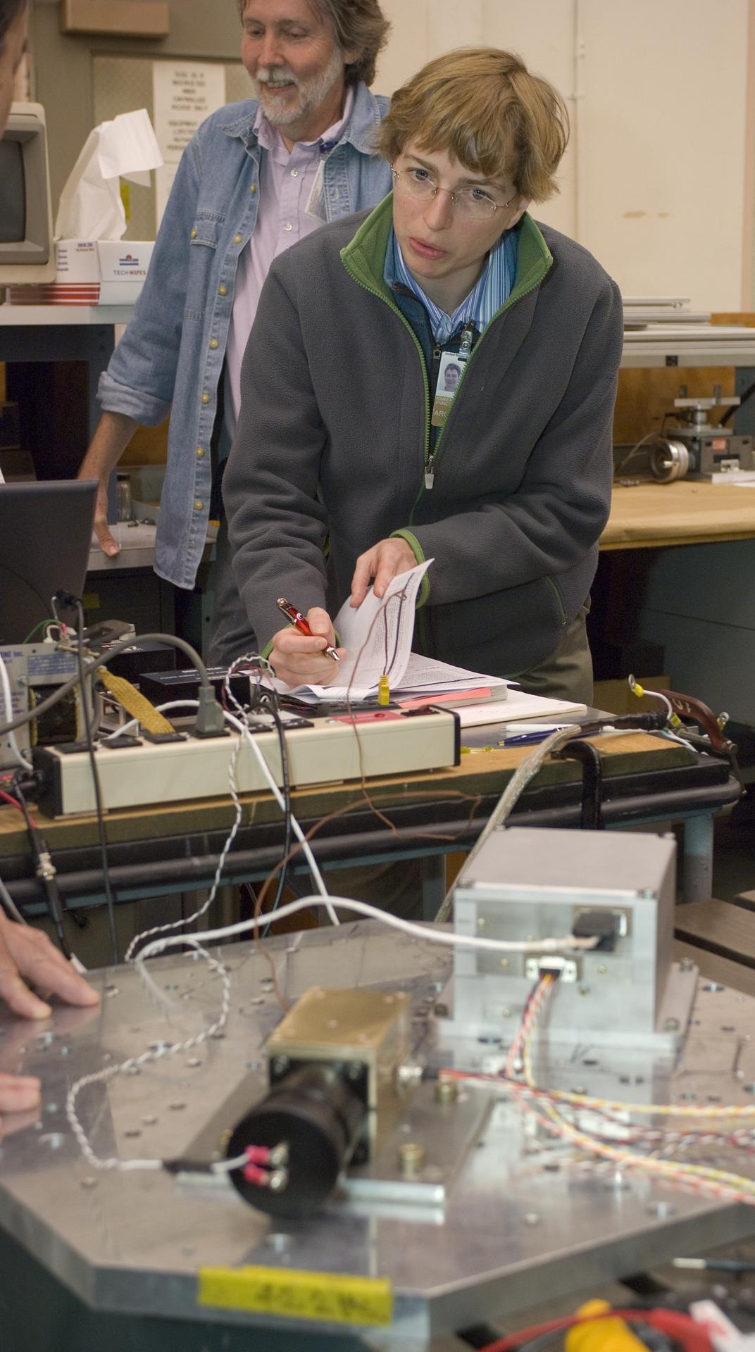 Lunar CRater Observation and Sensing Satellite (LCROSS) and P.I. at NASA Ames Research Center - Total Luminance Photometer shake test in N-244 EEL Laboratory; Kim Ennico takes notes on test set up