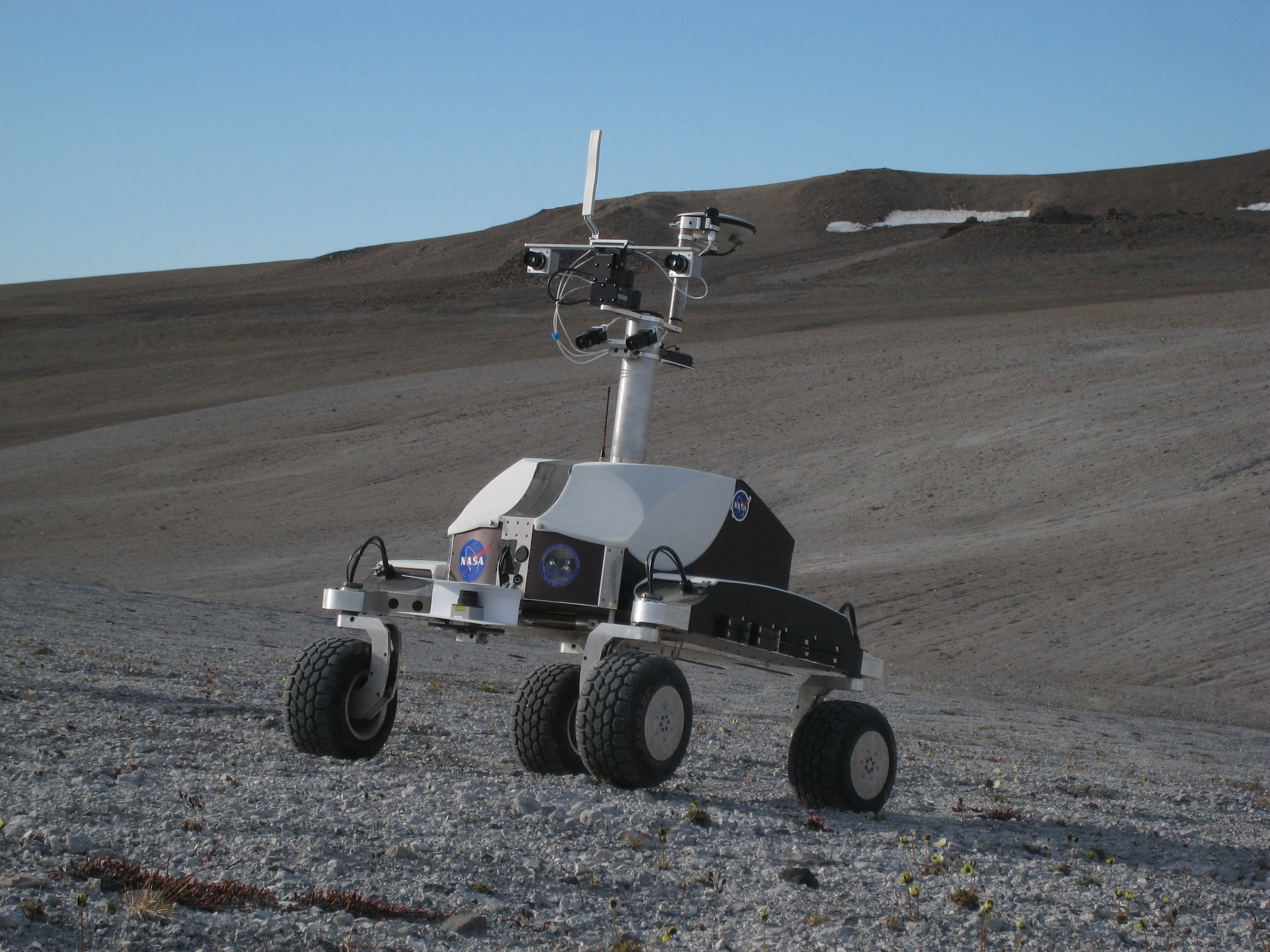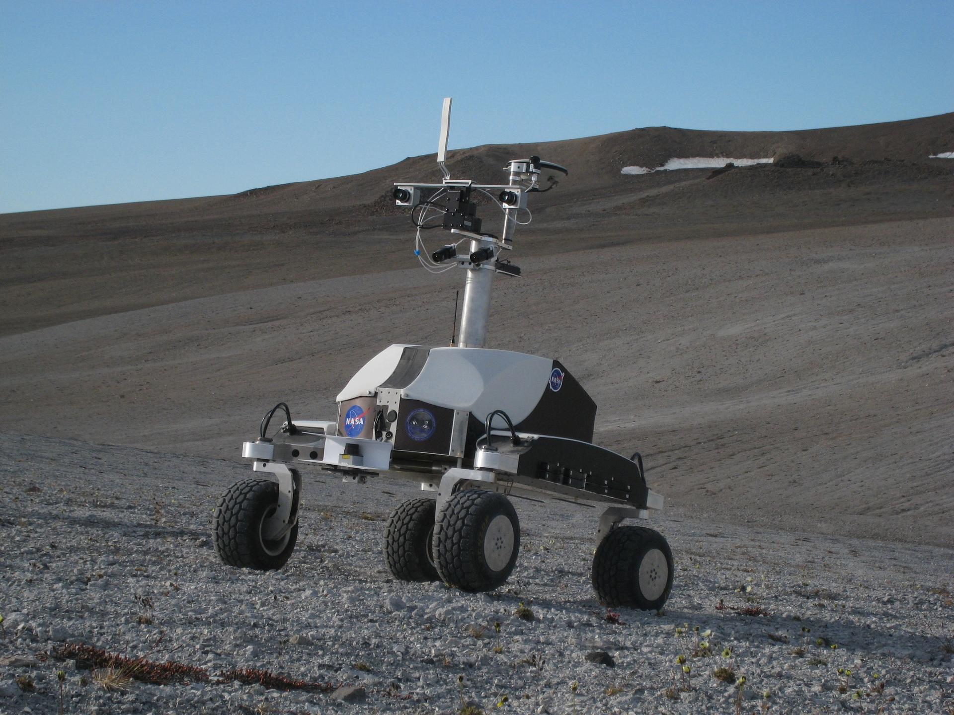 Haughton-Mars Project: - Photo credit to Matt Deans (NASA) K-10 Rover 'Black' driving on 'Drill Hill at Haughton Creater Devon Island, Nunavut, in the Canadian high arctic. Which lies in the 'frost rubble zone' of the Earth, i.e., in a polar desert environment and is the only crater known to lie in such an environment. Beginning in 1997, the crater and its surroundings are studied as a promising Mars analog by the NASA-led Haughton-Mars Project. (photo reference IMG_1278.JPG)