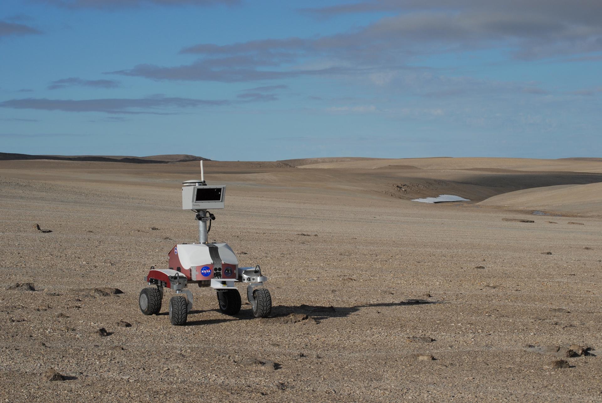 Haughton-Mars Project: - Photo credit to Matt Deans (NASA) K-10 Rover 'Red' base camp at Haughton Creater Devon Island, Nunavut, in the Canadian high arctic. Which lies in the 'frost rubble zone' of the Earth, i.e., in a polar desert environment and is the only crater known to lie in such an environment. Beginning in 1997, the crater and its surroundings are studied as a promising Mars analog by the NASA-led Haughton-Mars Project. (photo reference MCD_0859.JPG)