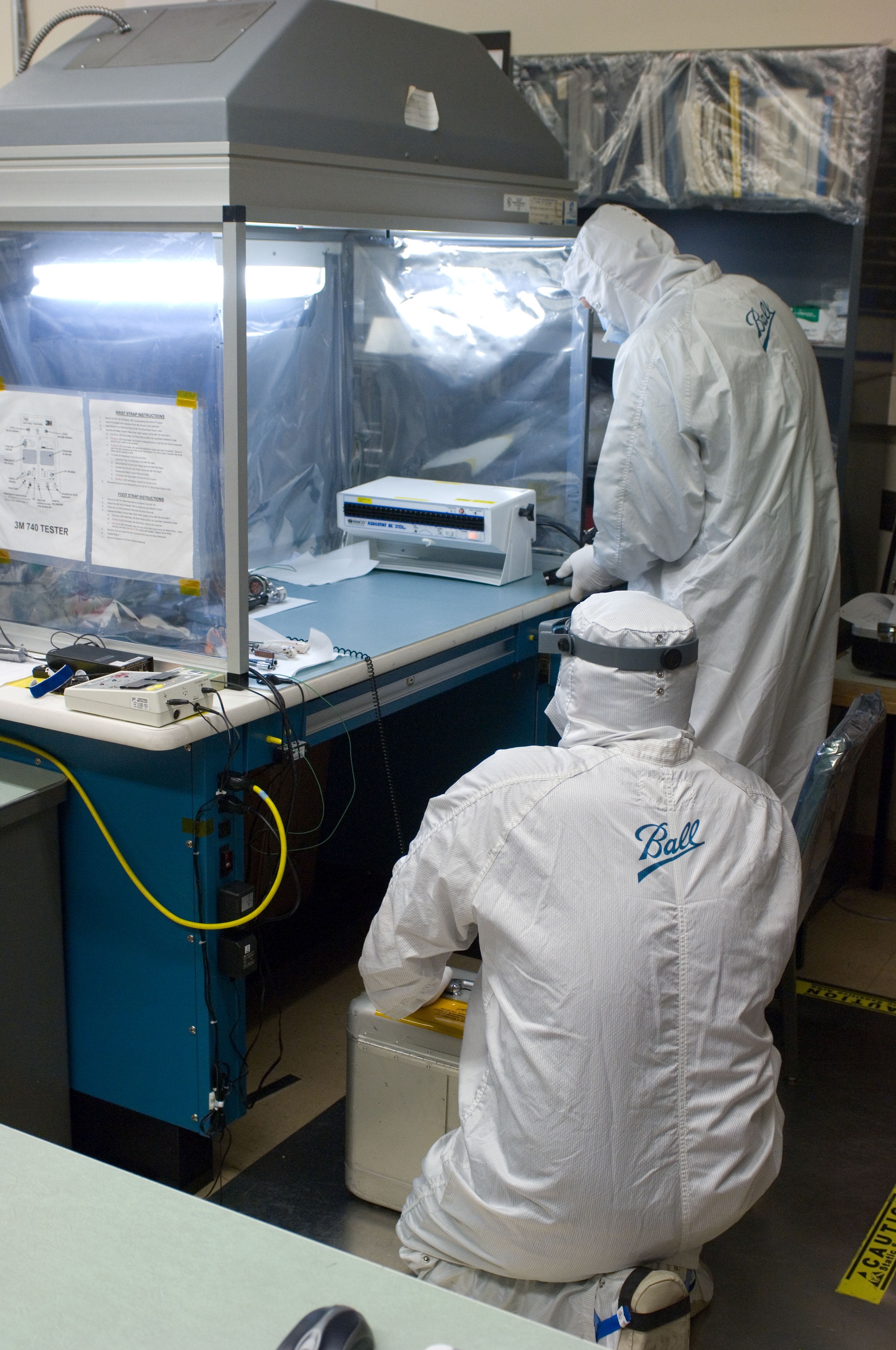 Kepler project; technicians from Ball Aerospace work on and in the test chamber assembled at Nasa Ames Research center testing components