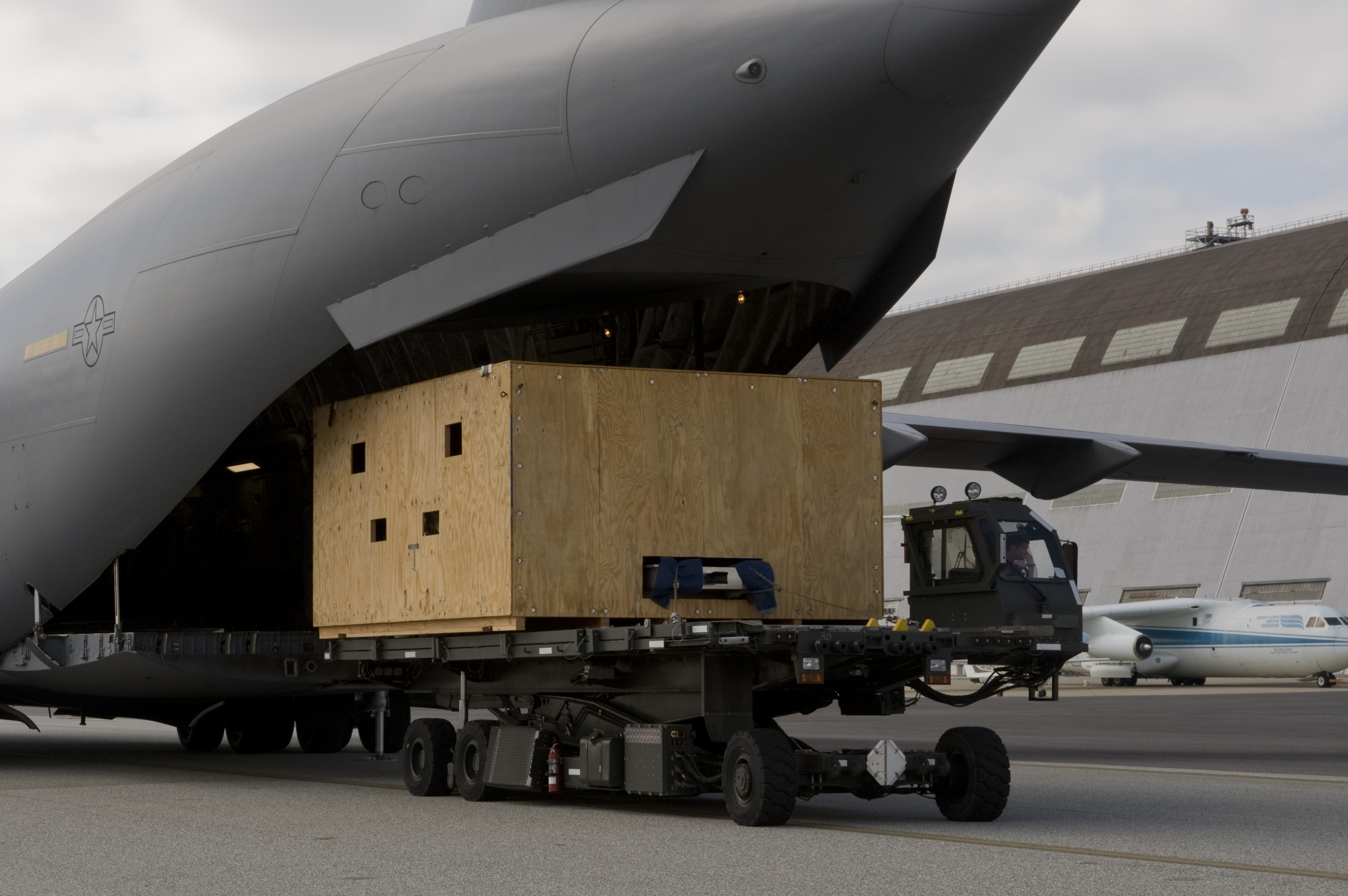 SOFIA (Stratospheric Observatory for Infrared Astromony) primary mirror coating completed at the Ames Vacuum Chamber in N-211 is being loaded on to a C-17 for the return trip to Dryden Flgiht Research Center