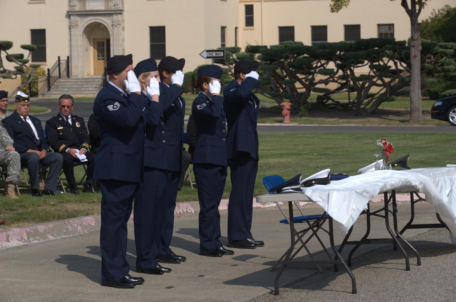 September 11th remembrance ceremony held in front of NASA Research Park Bldg-17 (Lunar Science Institute) hosted by the American Legion, Post 881, Moffett Field. Step off to Amazing Grace - POW/MIA Detail; TSgt Robert Soua, Detail Commander, 129th Security Forces, TSgt Rachel Velasco, SSgt Susan Avalos, SSgt Alex Cohen, SSgt Elias Gonzalez