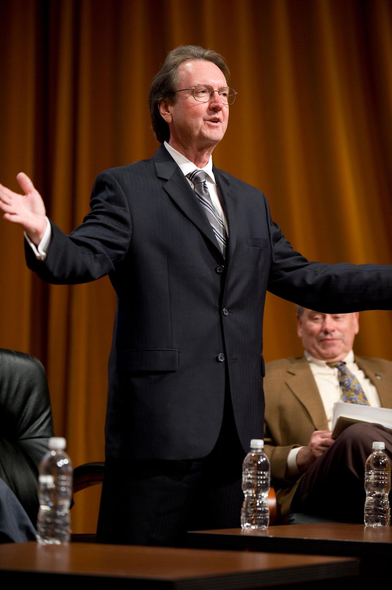 NASA's 50th Anniversay year. Panel discussion with four of NASA AMES's past center directors on how their tenure effected Ames and NASA. On the projects they pushed for and/or pushed forward and the culture of the center and the agency and how that worked for or against Ames, as well as major contributions of the time made by Ames Research Center. Panel L-R; Hans Mark, Sy Syvertson, Dale Compton, Scott Hubbard and Pete Worden, present director. (Past Directors served for periods from 1969 thru 2006)