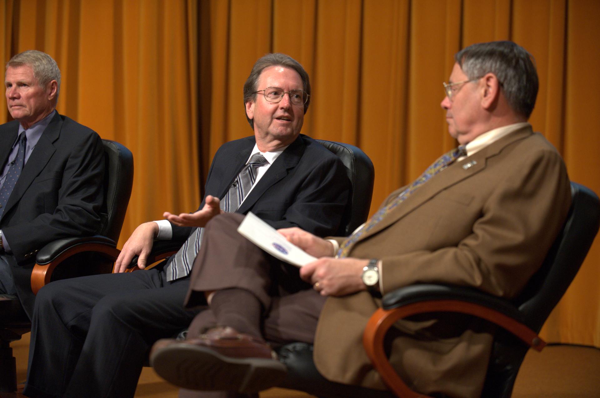 NASA's 50th Anniversay year. Panel discussion with four of NASA AMES's past center directors on how their tenure effected Ames and NASA. On the projects they pushed for and/or pushed forward and the culture of the center and the agency and how that worked for or against Ames, as well as major contributions of the time made by Ames Research Center. Panel L-R; Hans Mark, Sy Syvertson, Dale Compton, Scott Hubbard and Pete Worden, present director. (Past Directors served for periods from 1969 thru 2006)
