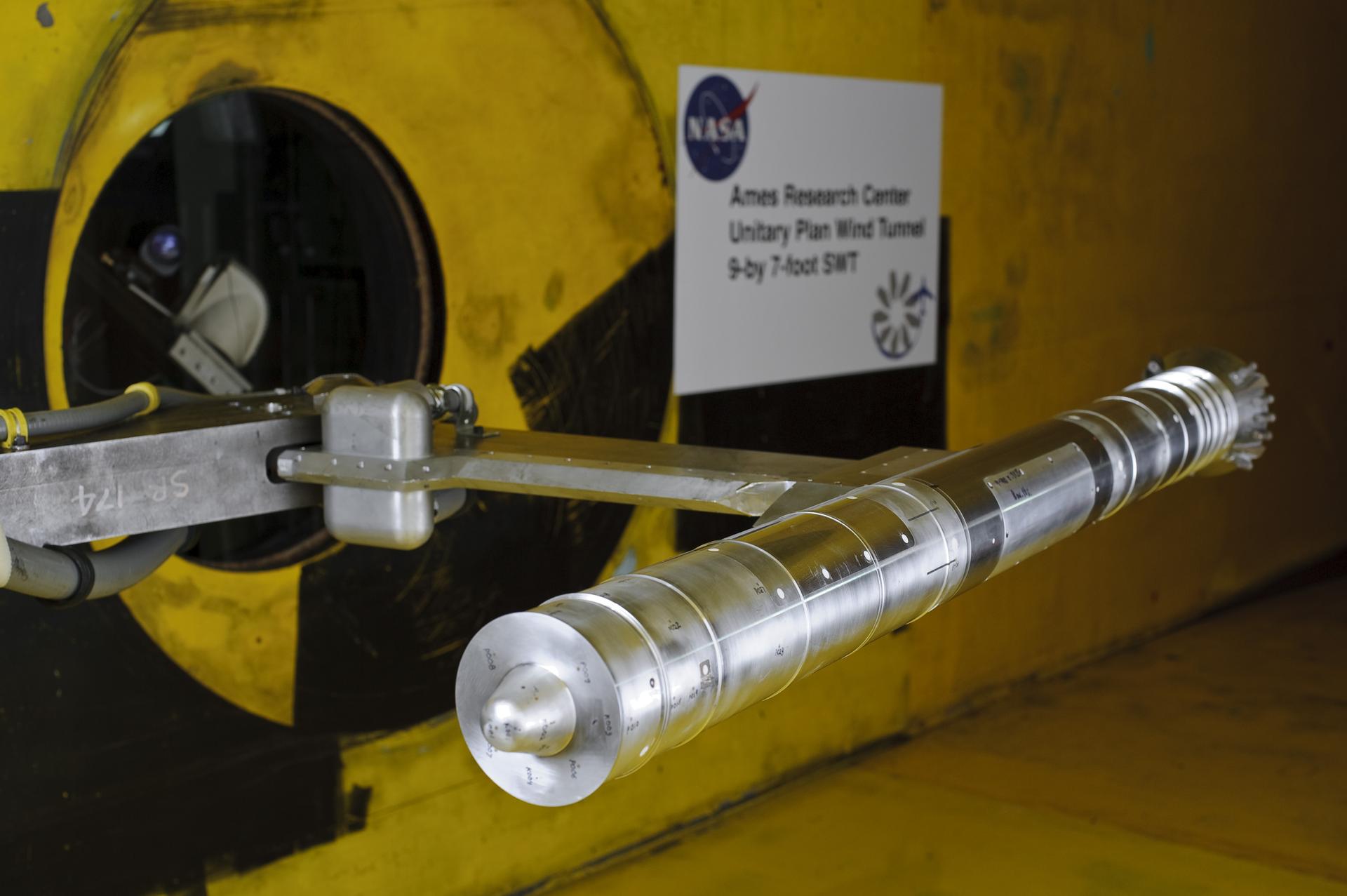 2.8% Ares I Acoustic Reentry Wind Tunnel Model in Ames 9X7ft Supersonic Wind Tunnel test-97-0193; model flying backwards in tunnel
