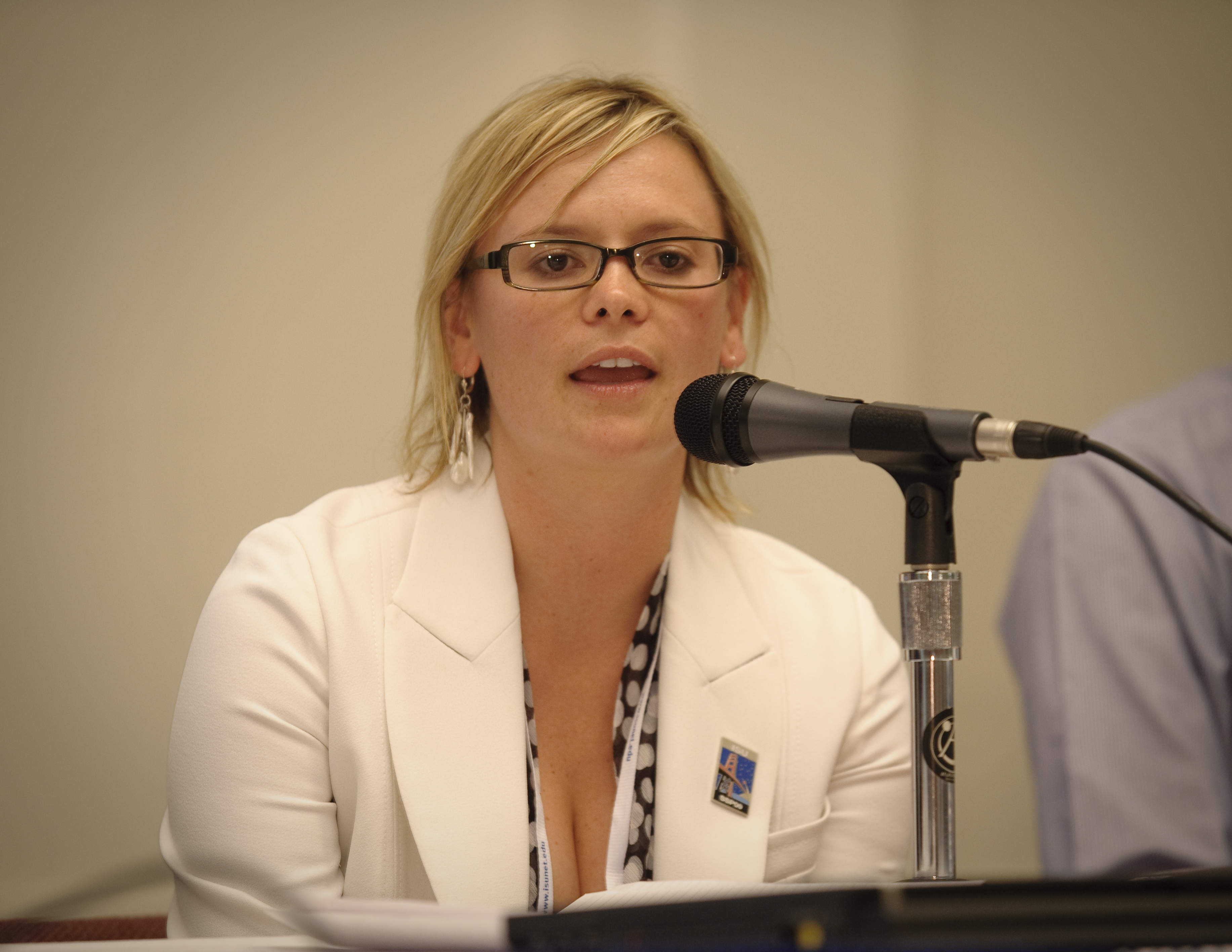 International Space University (ISU) and Singularity University (SU) Emerging Space Nations Panel held at NASA's Ames Research Center 2009 host site. Angie Bukley, ISU SSP09 program director, speaks with the panel moderator, Ray Williamson, ISU SSP09 distinguished lecturer and executive director of the Secure World Foundation, Superior, Colo., before the discussion begins.