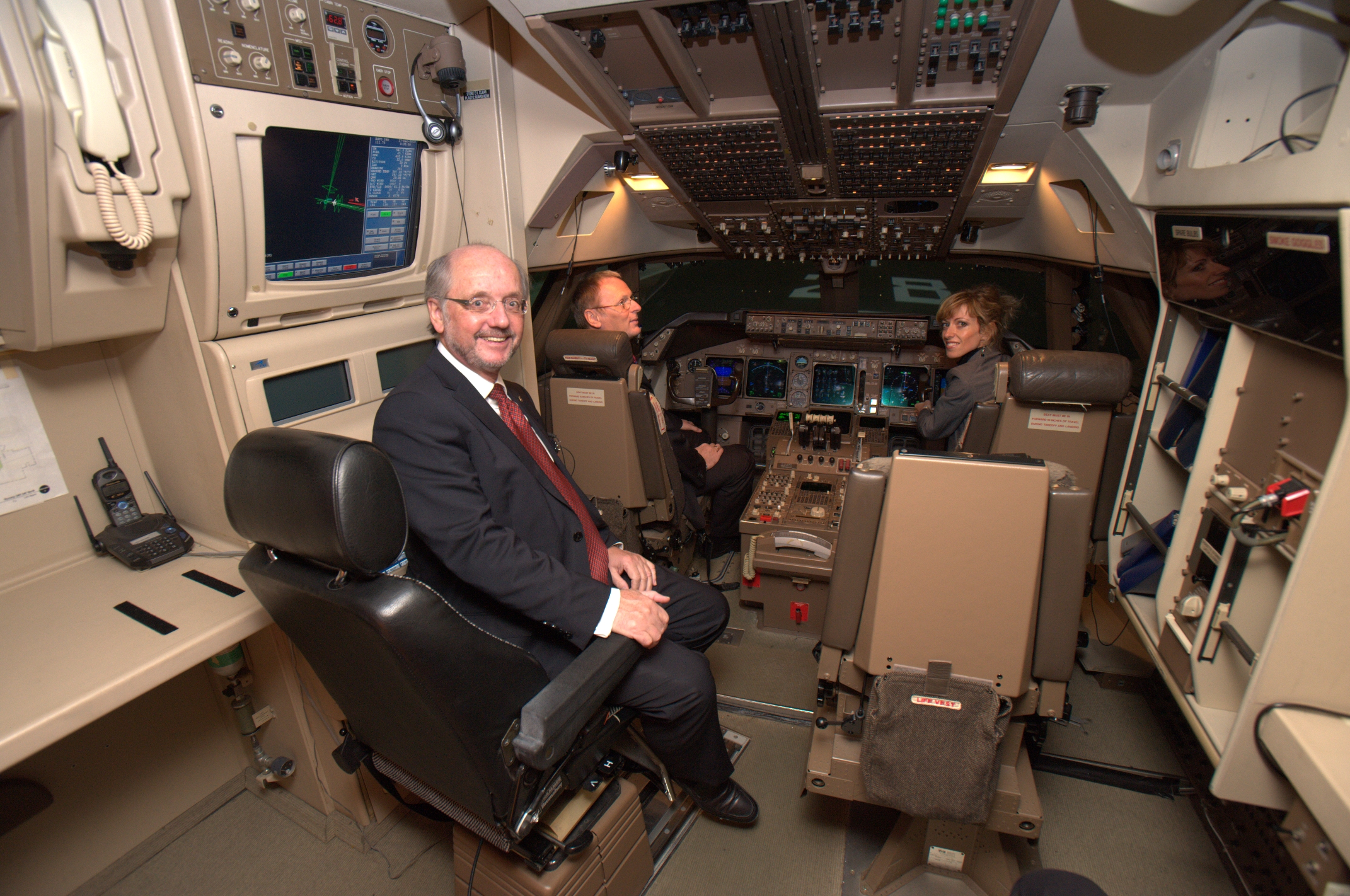 German Deligation visits Ames SOFIA Science Office for briefing and enjoy a Ames tour of CVSRF Simulator and 'fly' in the 774 cab with Ederhard Brockmann in front and Jochen Homann & Sandy Wrede in pilot/co-pilot seats.