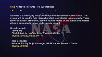 Provided as a media resource, this reel includes soundbites from the following: * Terry Fong, chief roboticist, NASA’s Ames Research Center * Jose Benavides, Astrobee facility project manager, NASA's Ames Research Center Astrobee is a free-flying robot system for the International Space Station. The system will be used to help researchers test technologies in zero-gravity. These robots can assist astronauts, perform routine chores on the station and operate either in automated mode or under remote control. Members of the news media interested in covering this topic should get in touch with the technology media contact at NASA’s Ames Research Center at https://www.nasa.gov/centers/ames/news/index.html Video Credit: NASA/Ames Research Center
