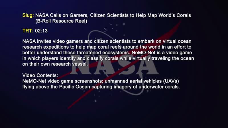 NASA invites video gamers and citizen scientists to embark on virtual ocean research expeditions to help map coral reefs around the world in an effort to better understand these threatened ecosystems. NeMO-Net is a video game in which players identify and classify corals while virtually traveling the ocean on their own research vessel.