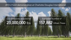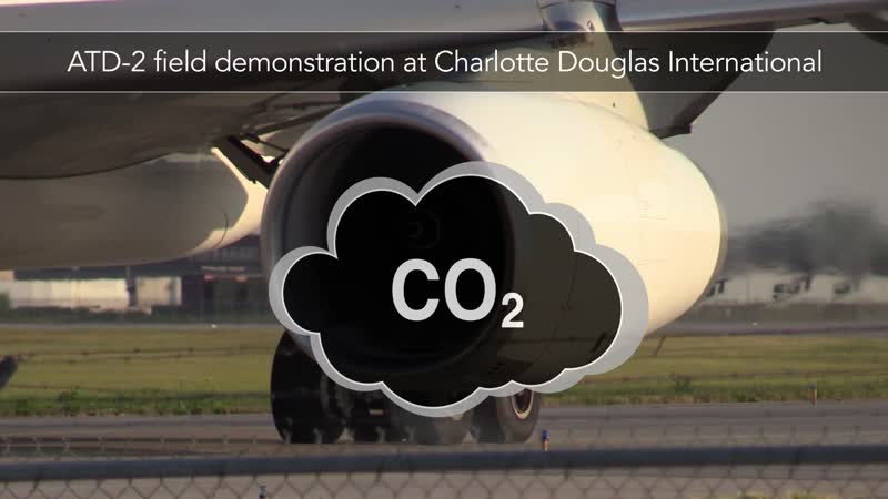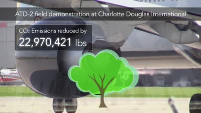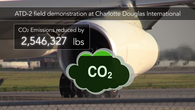 A silent video highlighting the decrease of carbon dioxide (CO2) emissions during the ATD-2 field demonstration at Charlotte Douglas International Airport (KCLT) in North Carolina. During four years, from September 2017 to September 2021, CO2 emissions were reduced by 23 million pounds, which is the equivalent of planting 172,000 urban trees.
