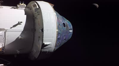 art001m1203270350 (Nov. 23, 2022) – On the eighth day of the Artemis I mission, a camera mounted on one of Orion’s solar arrays captured the spacecraft and the Moon as it continued toward distant retrograde orbit.