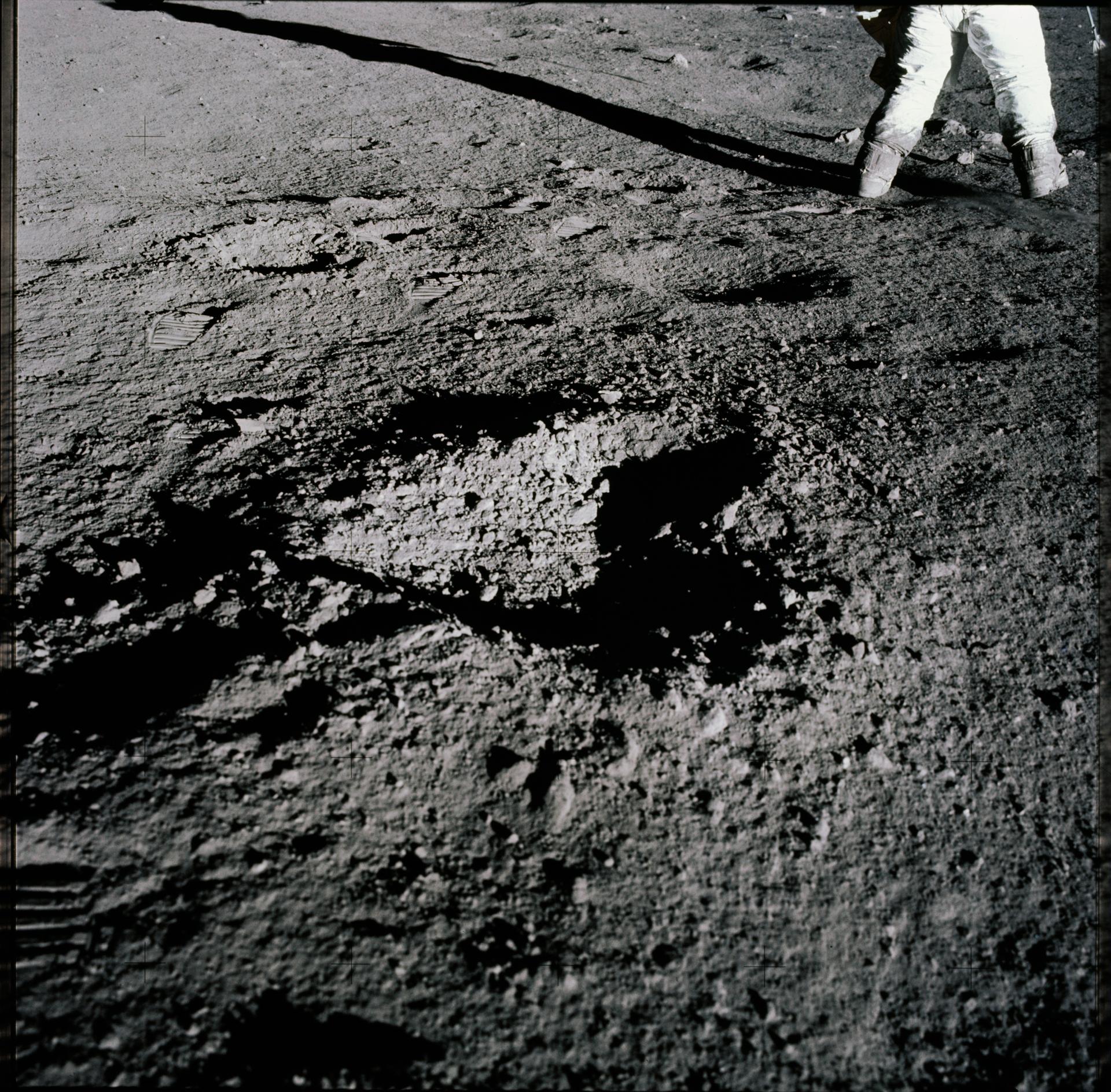 AS12-47-6938 (19 Nov. 1969) --- A close-up view of a heart-shaped depression (crater) in the lunar surface, as photographed during the Apollo 12 extravehicular activity (EVA). The legs of astronaut Charles Conrad Jr., commander, can be seen in the background. Astronaut Richard F. Gordon Jr., command module pilot, remained with the Command and Service Modules (CSM) in lunar orbit while astronauts Conrad and Alan L. Bean, lunar module pilot, descended in the Lunar Module (LM) to explore the moon.