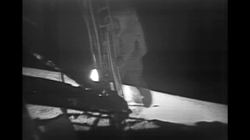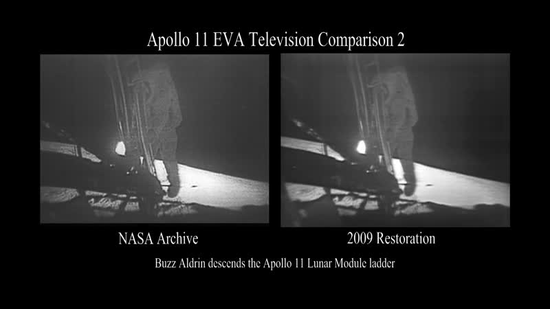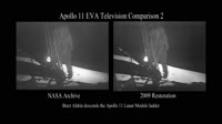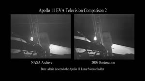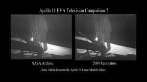 This video shows Buzz Aldrin descending the lunar module ladder. The video compares existing footage with the partially restored video. The thumbnail image shows the new footage on the left and the old on the right.