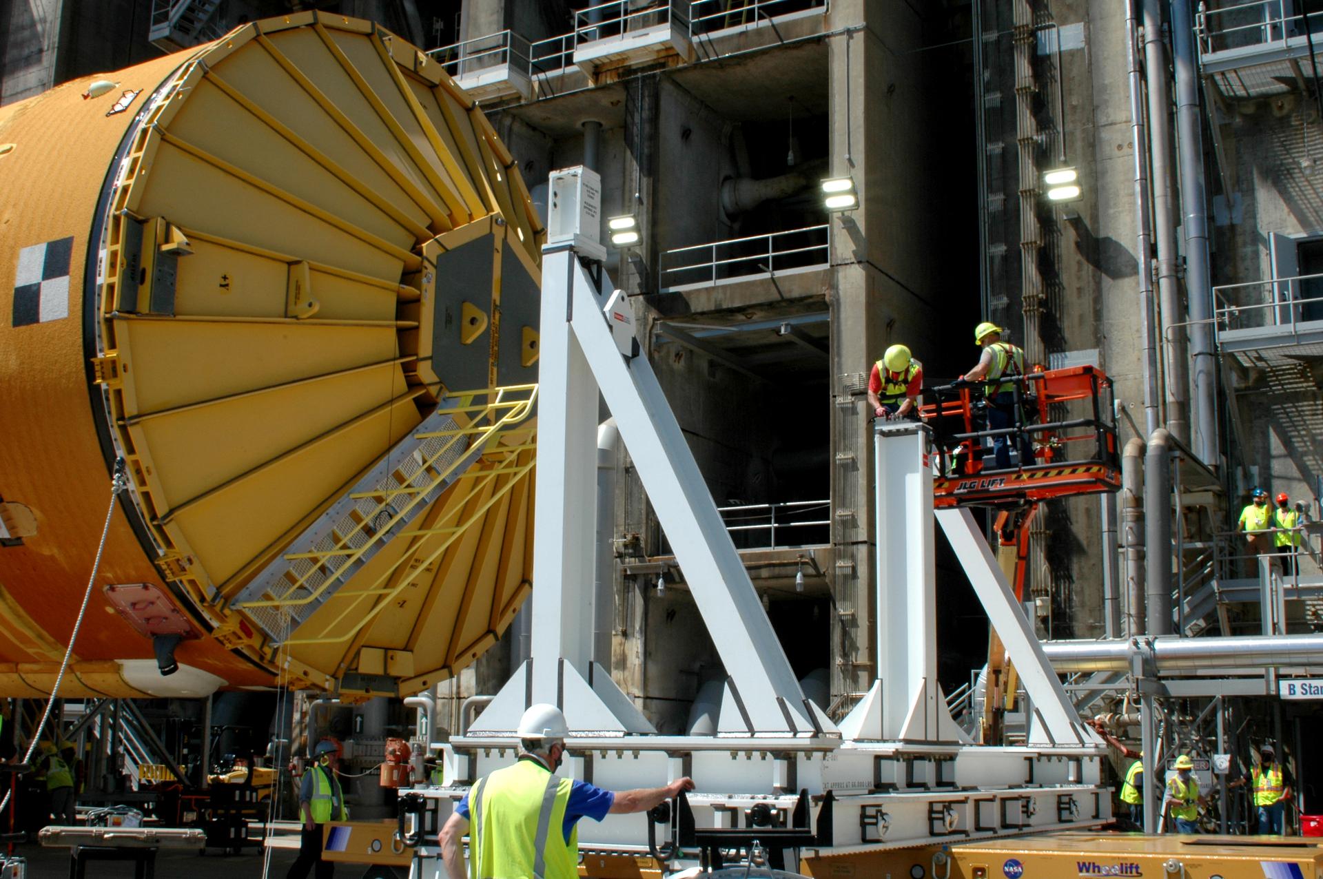 Team members at NASA’s Stennis Space Center near Bay St. Louis, Mississippi, load the first core stage of the agency’s Space Launch System (SLS) rocket on to the agency’s Pegasus barge in preparation for its transport to Kennedy Space Center in Florida. The loading activity followed removal of the stage from the B-2 Test Stand at Stennis on April 19-20, 2021. It comes about a month after NASA conducted a successful hot fire of the stage and its four RS-25 engines on March 18 and after teams completed various refurbishment activities. Once at Kennedy, the will be integrated with the rest of SLS rocket and prepared for the launch of the Artemis I mission to the Moon. Photo Credit: NASA