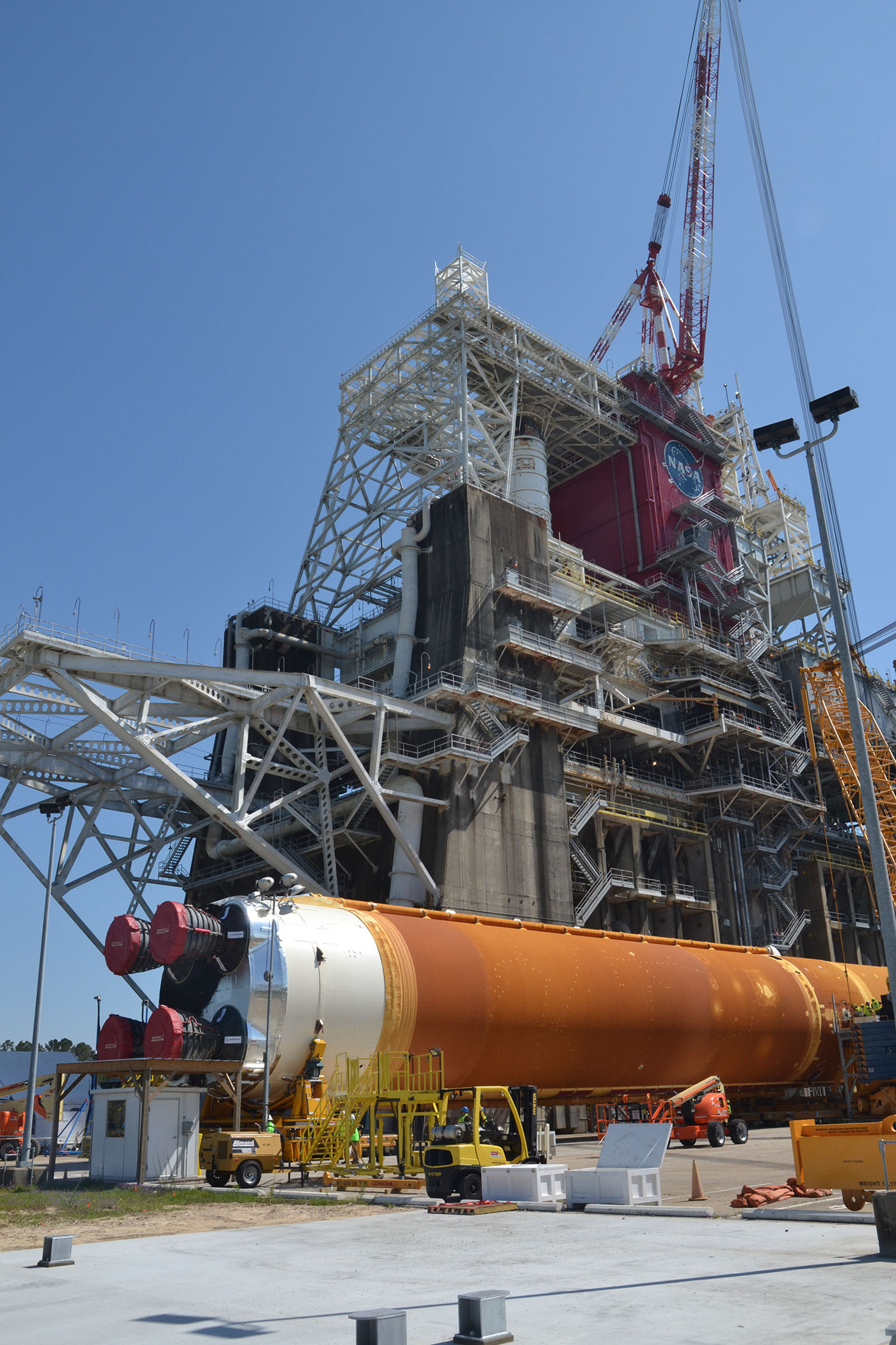 Team members at NASA’s Stennis Space Center near Bay St. Louis, Mississippi, load the first core stage of the agency’s Space Launch System (SLS) rocket on to the agency’s Pegasus barge in preparation for its transport to Kennedy Space Center in Florida. The loading activity followed removal of the stage from the B-2 Test Stand at Stennis on April 19-20, 2021. It comes about a month after NASA conducted a successful hot fire of the stage and its four RS-25 engines on March 18 and after teams completed various refurbishment activities. Once at Kennedy, the will be integrated with the rest of SLS rocket and prepared for the launch of the Artemis I mission to the Moon. Photo Credit: NASA