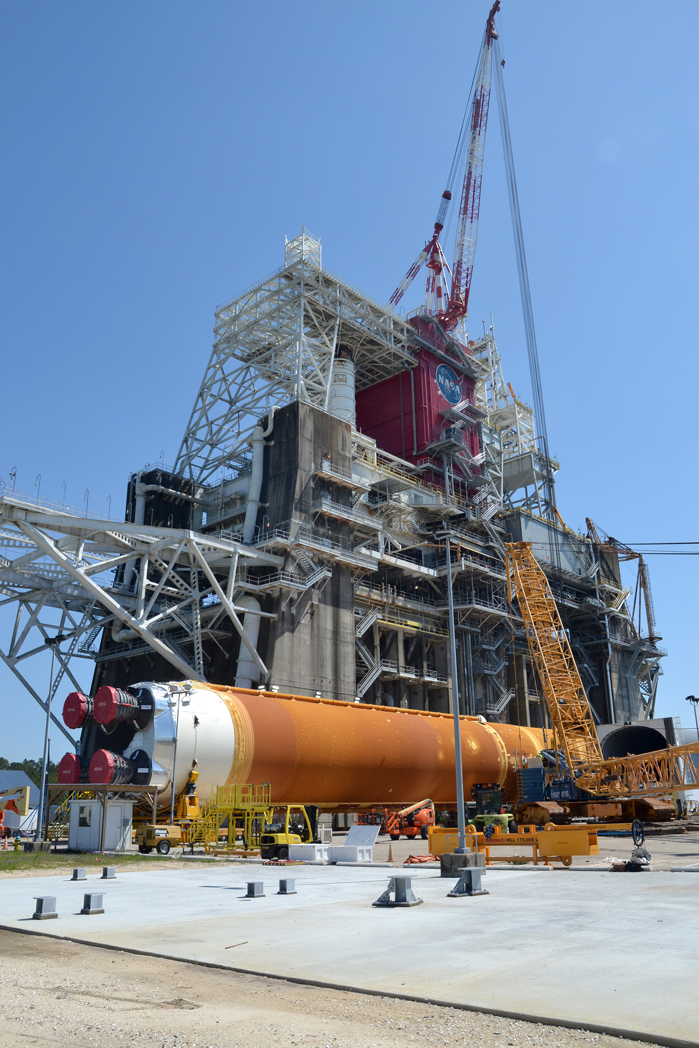 Team members at NASA’s Stennis Space Center near Bay St. Louis, Mississippi, load the first core stage of the agency’s Space Launch System (SLS) rocket on to the agency’s Pegasus barge in preparation for its transport to Kennedy Space Center in Florida. The loading activity followed removal of the stage from the B-2 Test Stand at Stennis on April 19-20, 2021. It comes about a month after NASA conducted a successful hot fire of the stage and its four RS-25 engines on March 18 and after teams completed various refurbishment activities. Once at Kennedy, the will be integrated with the rest of SLS rocket and prepared for the launch of the Artemis I mission to the Moon. Photo Credit: NASA