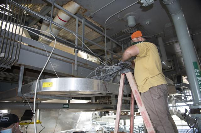 Team members at NASA’s Stennis Space Center near Bay St. Louis, Mississippi, complete refurbishment work on the first core stage of the agency’s Space Launch System (SLS) rocket. The work followed a successful hot fire of the stage and its four RS-25 engines March 18. The hot fire marked the culmination of a yearlong Green Run series of tests of the stage and its integrated systems. Following refurbishment work, the core stage will be removed from the test stand and transported to Kennedy Space Center in Florida, aboard NASA’s Pegasus barge, shown delivering equipment to the B-2 Test Stand. At Kennedy, the core stage will be integrated with the rest of SLS rocket and prepared for the launch of the Artemis I mission to the Moon. Photo Credit: NASA
