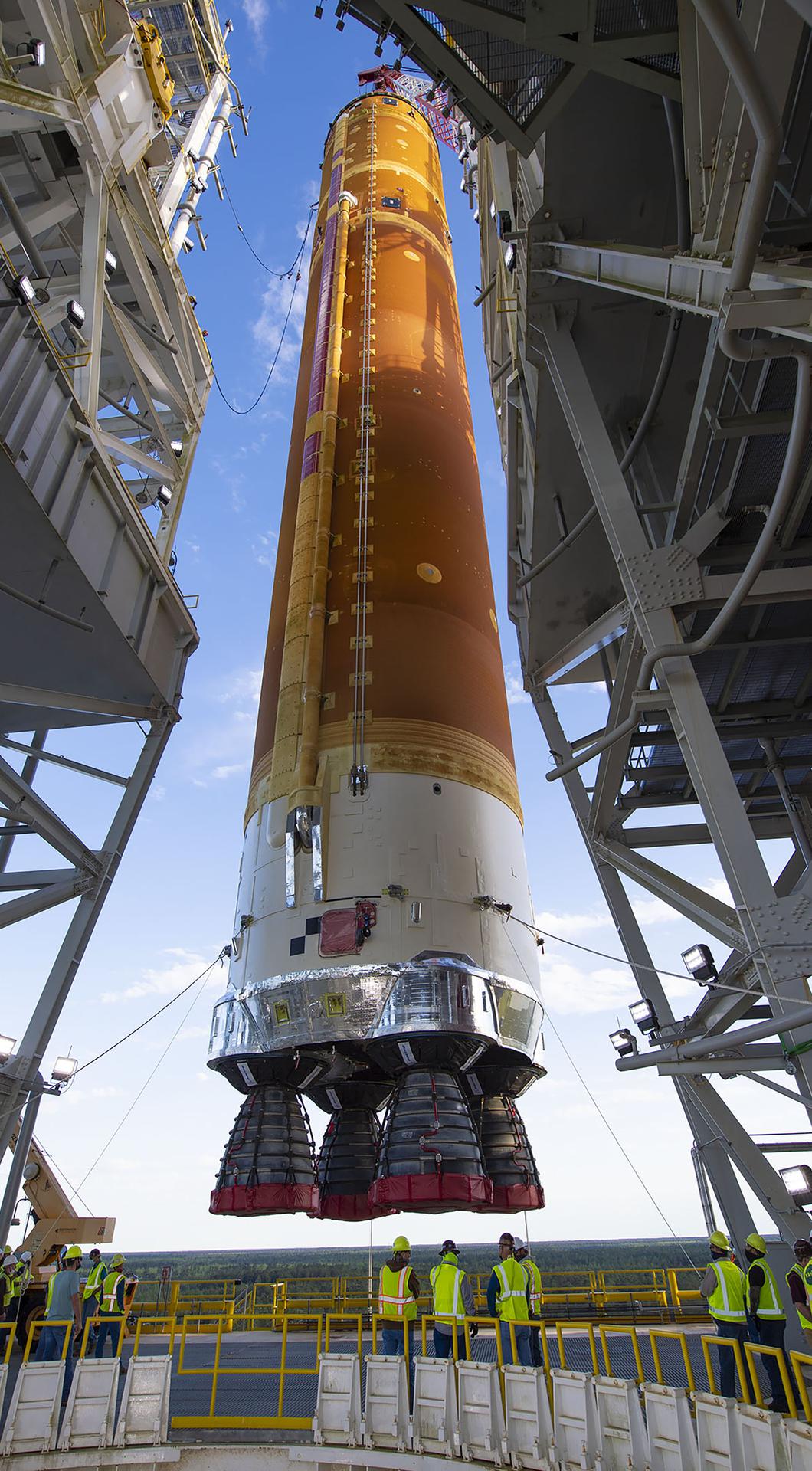Following a successful Green Run hot fire at NASA’s Stennis Space Center near Bay St. Louis, Mississippi, on March 18, members of a blended team work April 19-20 to remove the first core stage of the agency’s Space Launch System (SLS) rocket from the B-2 Test Stand. The work required crews to lift the core stage from its vertical placement in the stand and lower it to a horizontal position on the B-2 Test Stand tarmac. The stage now will be loaded on NASA’s Pegasus barge for transport to Kennedy, where it will be prepared for launch of the Artemis I mission. Removal of the largest rocket stage ever built by NASA followed completion of a series of eight Green Run tests over the past year. During the Green Run series, teams performed a comprehensive test of the stand’s sophisticated and integrated systems. Photo Credit: NASA