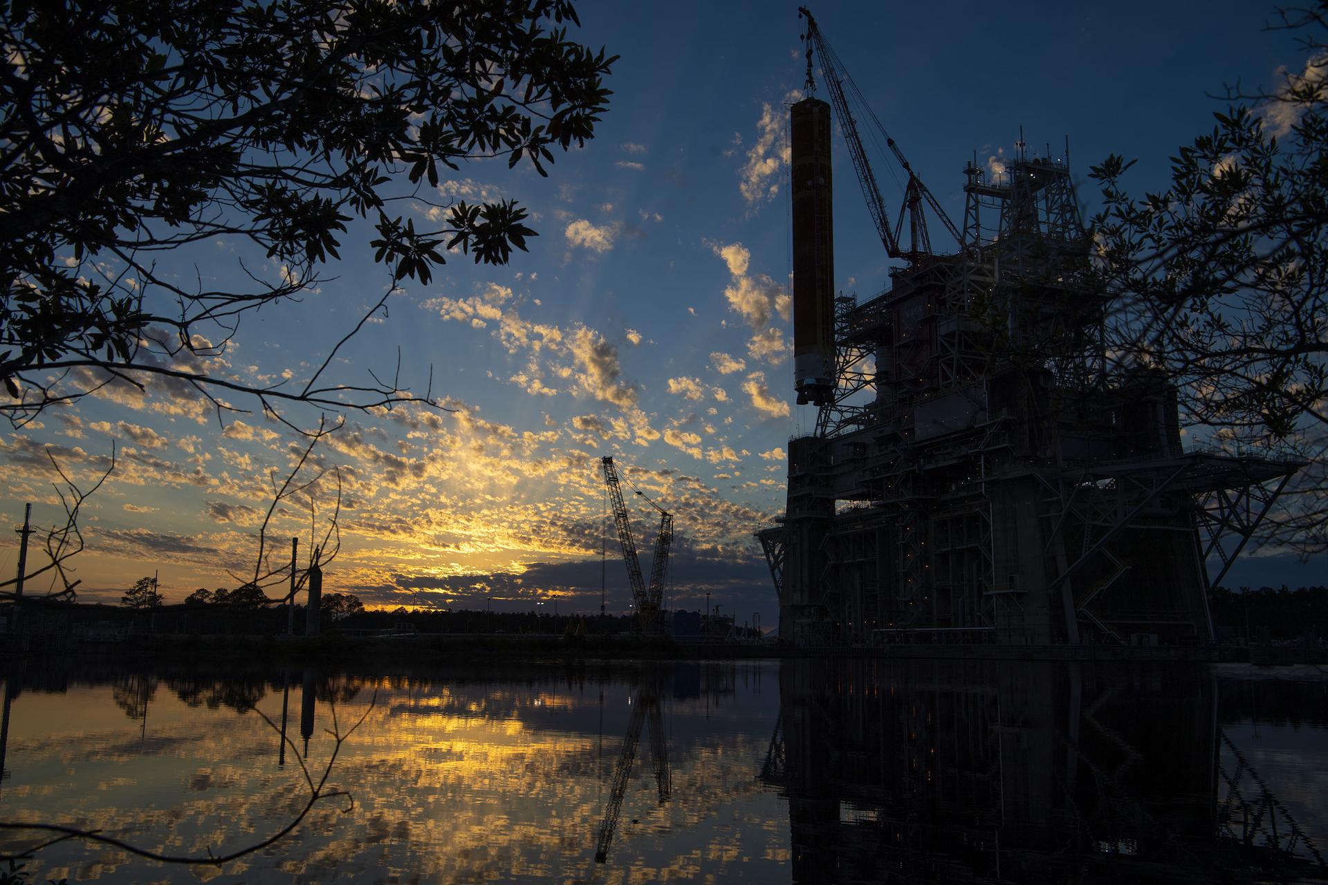 Following a successful Green Run hot fire at NASA’s Stennis Space Center near Bay St. Louis, Mississippi, on March 18, members of a blended team work April 19-20 to remove the first core stage of the agency’s Space Launch System (SLS) rocket from the B-2 Test Stand. The work required crews to lift the core stage from its vertical placement in the stand and lower it to a horizontal position on the B-2 Test Stand tarmac. The stage now will be loaded on NASA’s Pegasus barge for transport to Kennedy, where it will be prepared for launch of the Artemis I mission. Removal of the largest rocket stage ever built by NASA followed completion of a series of eight Green Run tests over the past year. During the Green Run series, teams performed a comprehensive test of the stand’s sophisticated and integrated systems. Photo Credit: NASA
