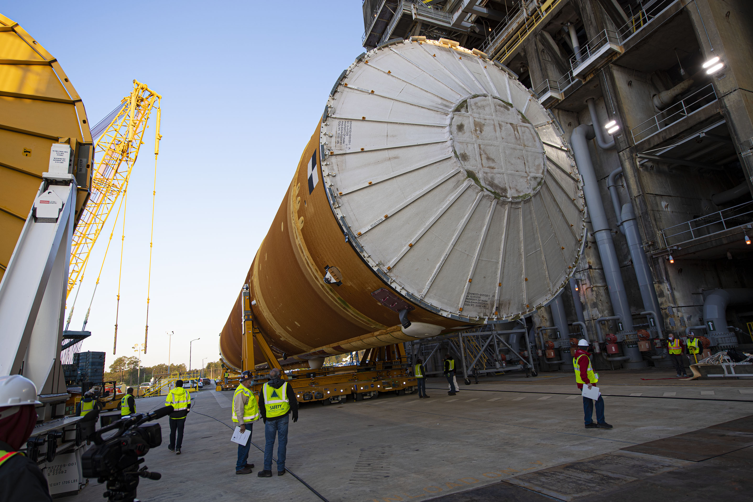 Team members at NASA’s Stennis Space Center near Bay St. Louis, Mississippi, load the first core stage of the agency’s Space Launch System (SLS) rocket on to the agency’s Pegasus barge in preparation for its transport to Kennedy Space Center in Florida. The loading activity followed removal of the stage from the B-2 Test Stand at Stennis on April 19-20, 2021. It comes about a month after NASA conducted a successful hot fire of the stage and its four RS-25 engines on March 18 and after teams completed various refurbishment activities. Once at Kennedy, the will be integrated with the rest of SLS rocket and prepared for the launch of the Artemis I mission to the Moon. Photo Credit: NASA