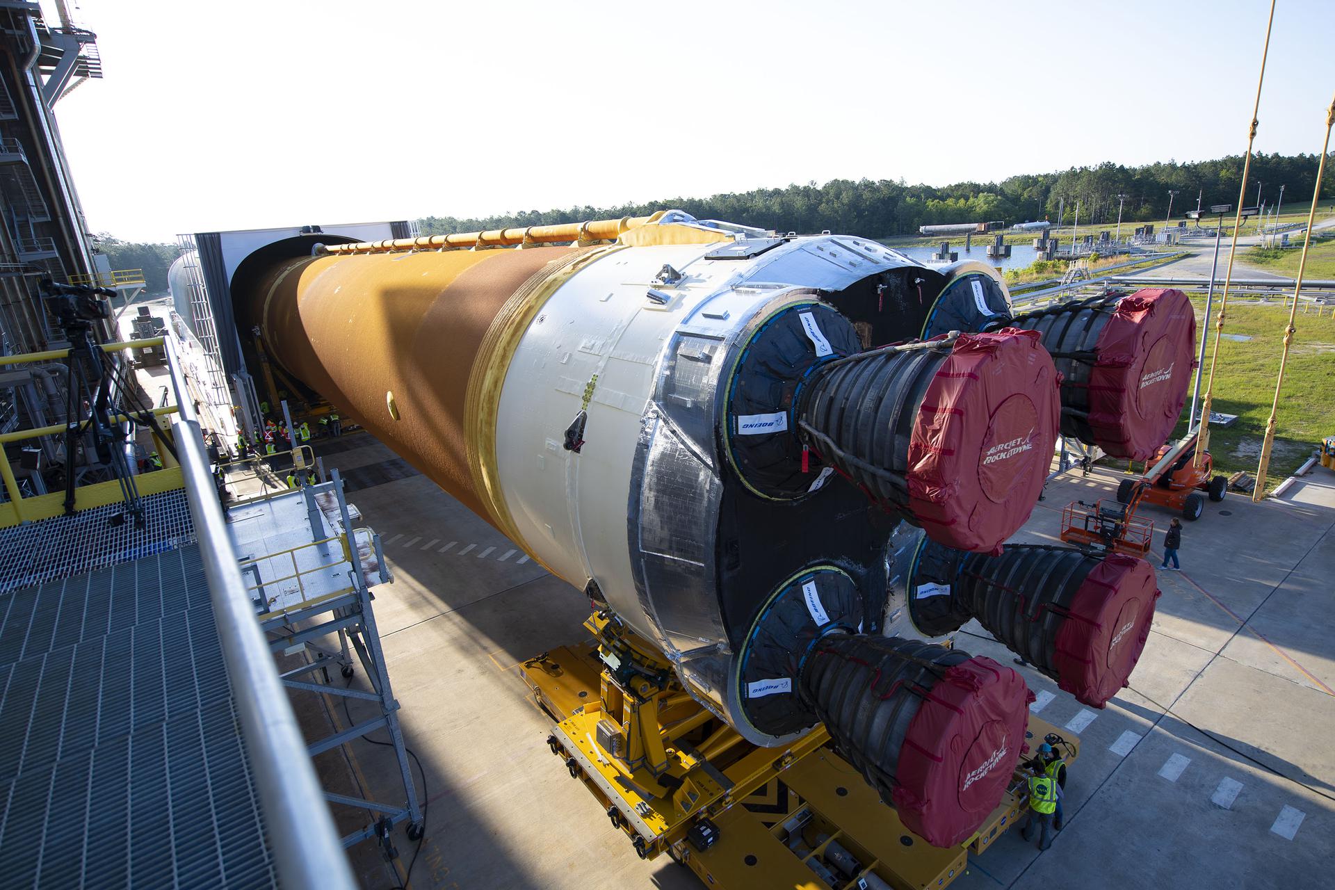 Team members at NASA’s Stennis Space Center near Bay St. Louis, Mississippi, load the first core stage of the agency’s Space Launch System (SLS) rocket on to the agency’s Pegasus barge in preparation for its transport to Kennedy Space Center in Florida. The loading activity followed removal of the stage from the B-2 Test Stand at Stennis on April 19-20, 2021. It comes about a month after NASA conducted a successful hot fire of the stage and its four RS-25 engines on March 18 and after teams completed various refurbishment activities. Once at Kennedy, the will be integrated with the rest of SLS rocket and prepared for the launch of the Artemis I mission to the Moon. Photo Credit: NASA