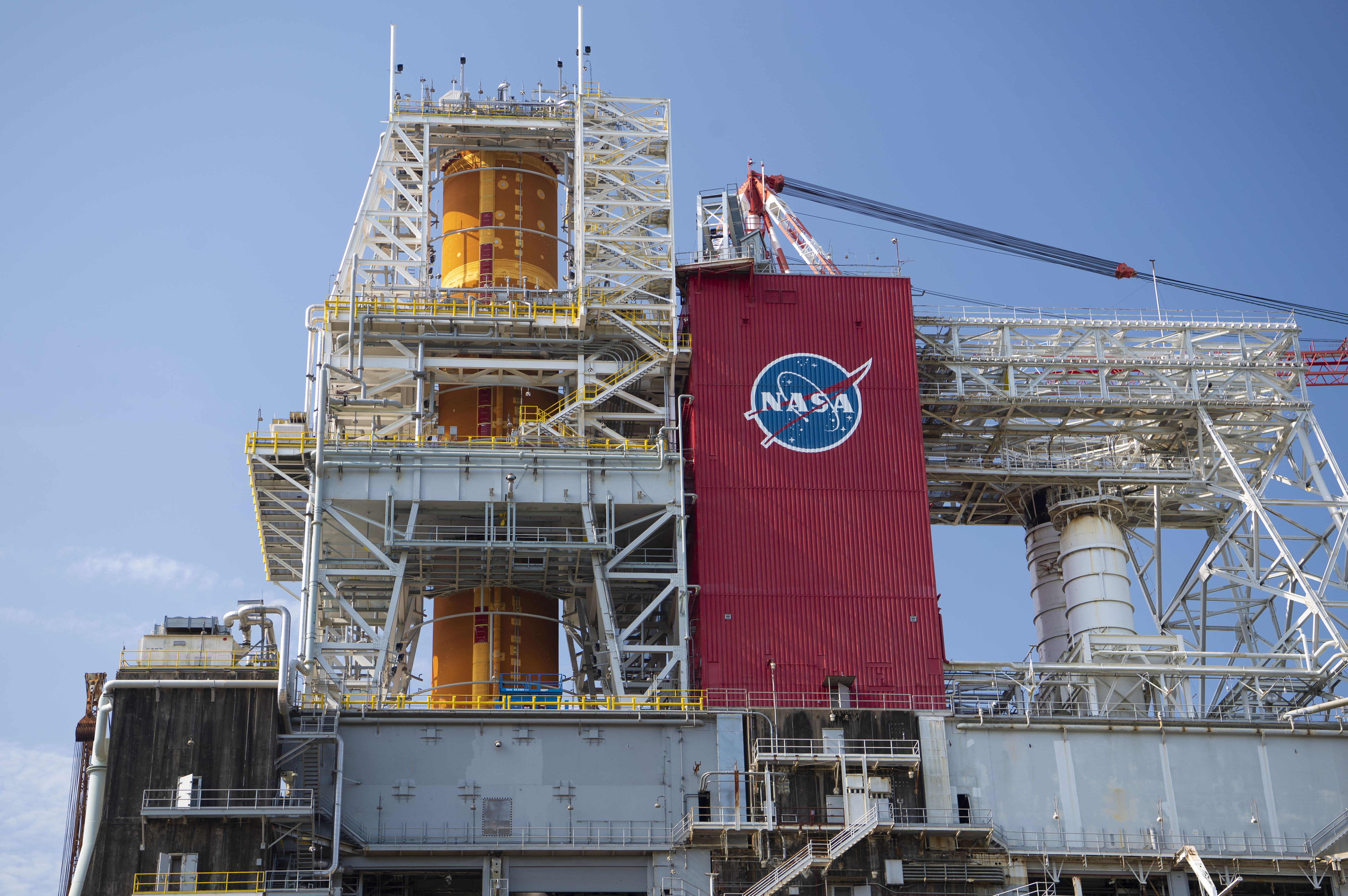 A photo from the north (flame trench) side of the B-2 Test Stand at NASA’s Stennis Space Center shows the first flight core stage for NASA’s new Space Launch System (SLS) rocket installed for Green Run testing. The SLS core stage was transported to Stennis in January to begin Green Run testing prior to its use on the Artemis I mission. NASA is building SLS to return humans, including the first woman, to the Moon as part of the Artemis program and to prepare for eventual missions to Mars. At Stennis, the SLS core stage will undergo a series of tests on its integrated systems, culminating with a hot fire of its four RS-25 engines, just as during an actual launch.