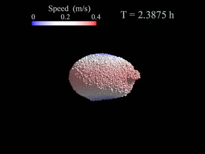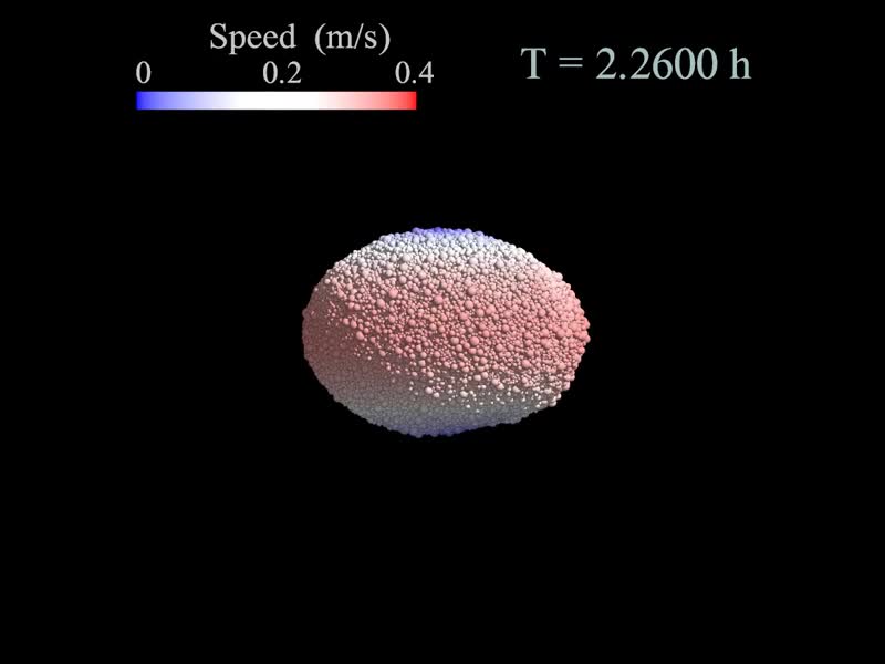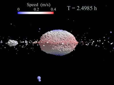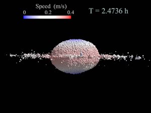 Based on the internal and surface properties described in Barnouin et al. (2024), this video demonstrates how the spin-up of asteroid Didymos could have led to the growth of its equatorial ridge and the formation of the smaller asteroid Dimorphos, seen orbiting the former near the end of the clip. Particles are colored according to their speeds, with the scale shown at the top, along with the continually changing spin period of Didymos. (Credit: University of Michigan/Yun Zhang and Johns Hopkins APL/Olivier Barnouin)
