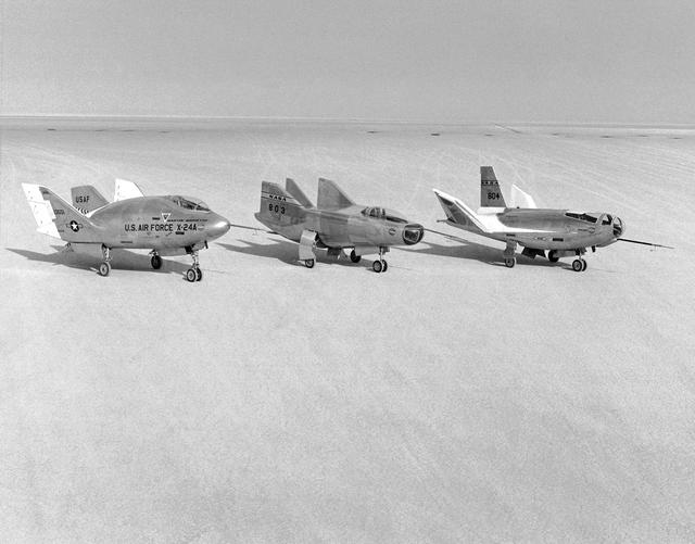The wingless, lifting body aircraft sitting on Rogers Dry Lake at what is now NASA's Dryden Flight Research Center, Edwards, California, from left to right are the X-24A, M2-F3 and the HL-10. The lifting body aircraft studied the feasibility of maneuvering and landing an aerodynamic craft designed for reentry from space. These lifting bodies were air launched by a B-52 mother ship, then flew powered by their own rocket engines before making an unpowered approach and landing. They helped validate the concept that a space shuttle could make accurate landings without power. The X-24A flew from April 17, 1969 to June 4, 1971. The M2-F3 flew from June 2, 1970 until December 20, 1972. The HL-10 flew from December 22, 1966 until July 17, 1970 and logged the highest and fastest records in the lifting body program.