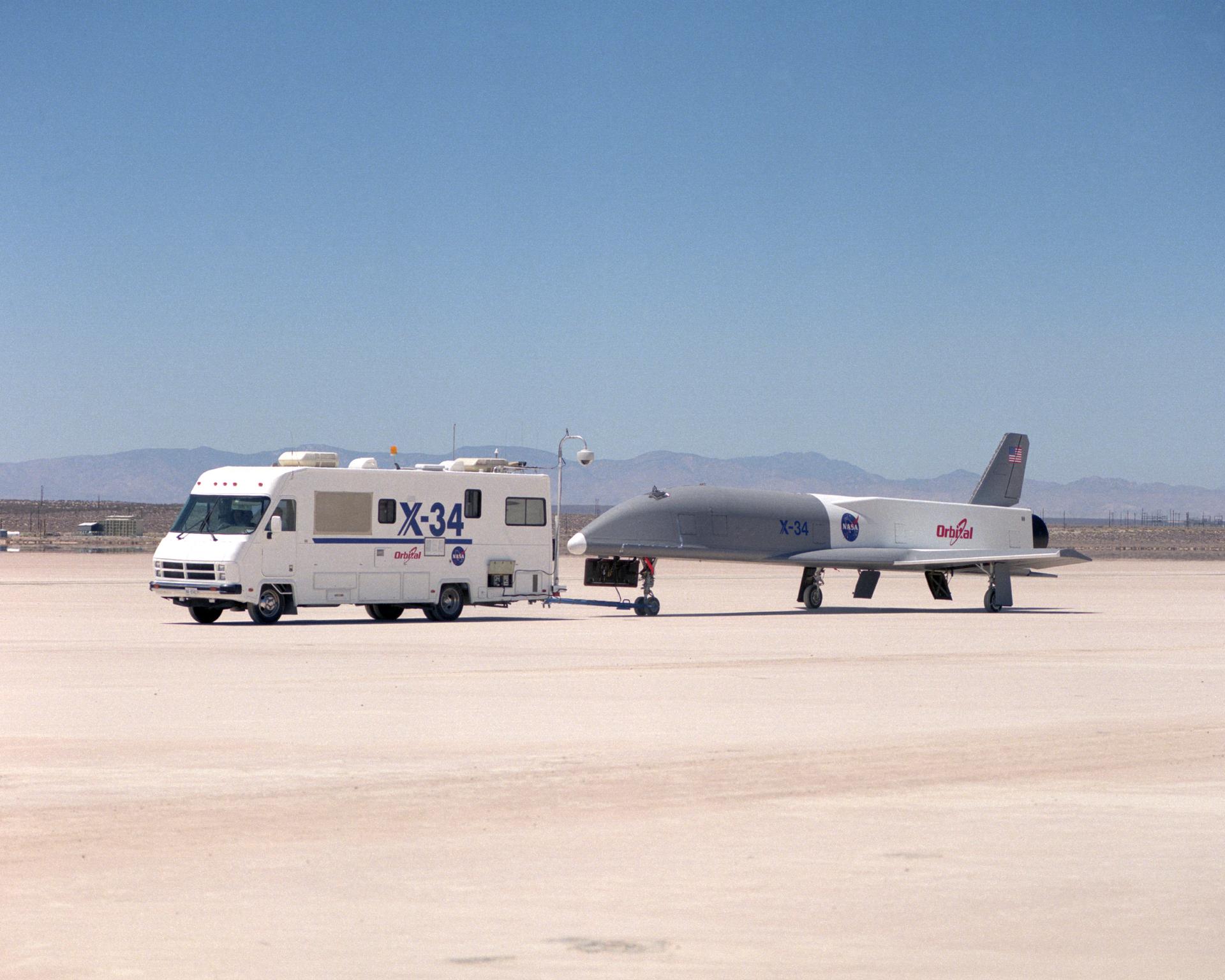 Following initial captive flight tests last year at NASA's Dryden Flight Research Center, Edwards Air Force Base, California, the X-34 technology demonstrator began a new series of tests last week in which it is being towed behind a semi-truck and released to coast on the Edwards dry lakebed. On July 20, 2000, it was towed and released twice at speeds of five and 10 miles per hour. On July 24, 2000, it was towed and released twice at 10 and 30 miles per hour. Twelve tests are planned during which the X-34 will be towed for distances up to 10,000 feet and released at speeds up to 80 miles per hour. The test series is expected to last at least six weeks.