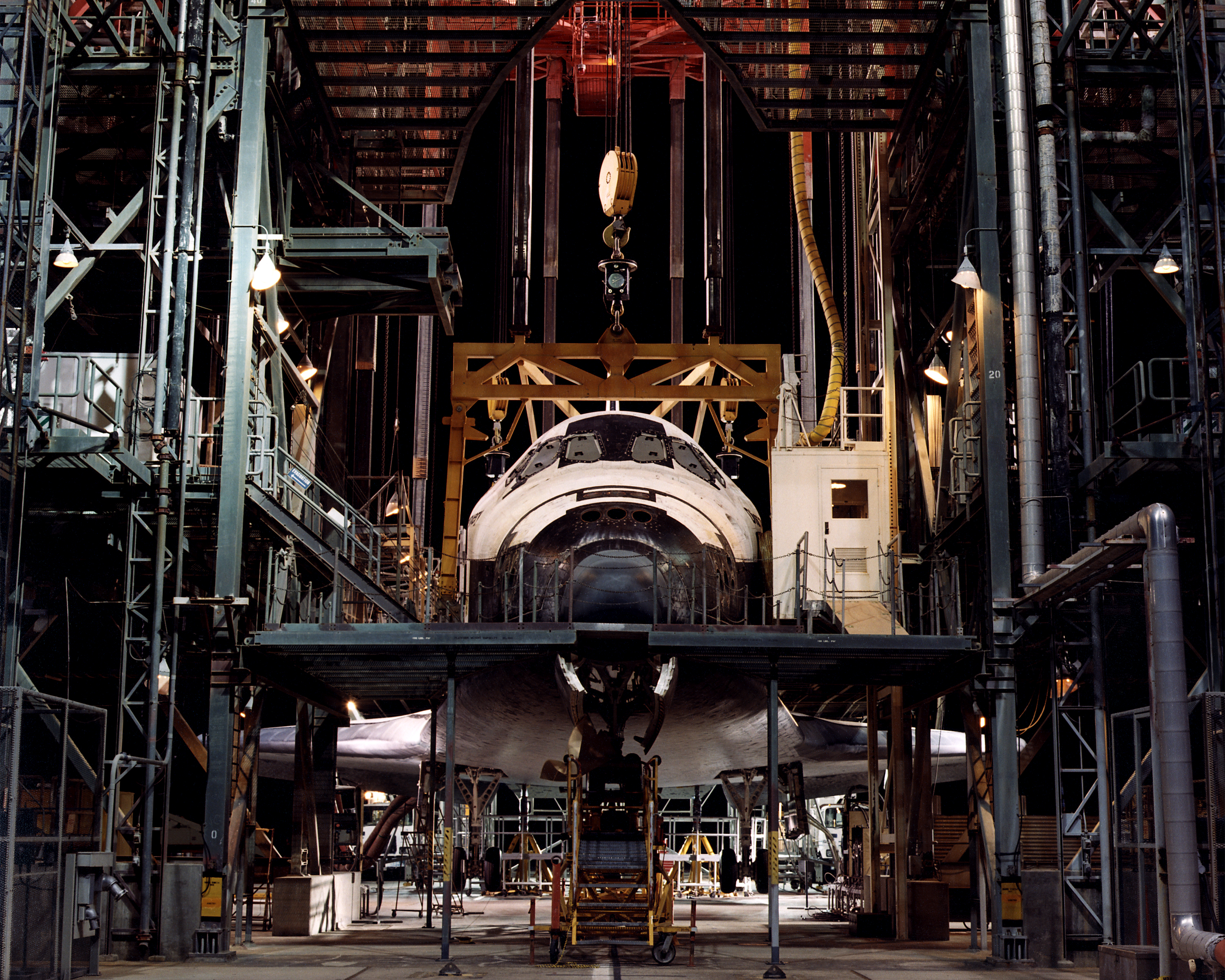 The Space Shuttle Discovery is centered in the Mate-Demate Device (MDD) at NASA’s Dryden Flight Research Center at Edwards, California. The gantry-like MDD structure is used for servicing the shuttle orbiters in preparation for their ferry flight back to the Kennedy Space Center in Florida, including mounting the shuttle atop NASA’s modified Boeing 747 Shuttle Carrier Aircraft.