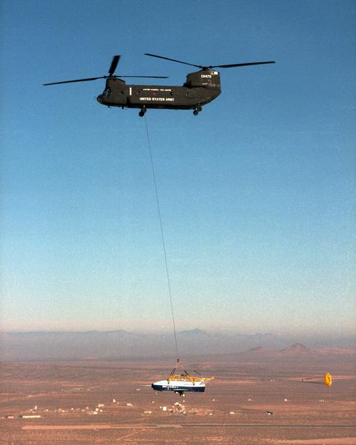 With a small stabilization parachute trailing behind, the X-40 sub-scale technology demonstrator is suspended under a U.S. Army CH-47 Chinook cargo helicopter during a captive-carry test flight at NASA's Dryden Flight Research Center, Edwards, California. The captive carry flights are designed to verify the X-40's navigation and control systems, rigging angles for its sling, and stability and control of the helicopter while carrying the X-40 on a tether. Following a series of captive-carry flights, the X-40 made free flights from a launch altitude of about 15,000 feet above ground, gliding to a fully autonomous landing. The X-40 is an unpowered 82 percent scale version of the X-37, a Boeing-developed spaceplane designed to demonstrate various advanced technologies for development of future lower-cost access to space vehicles.