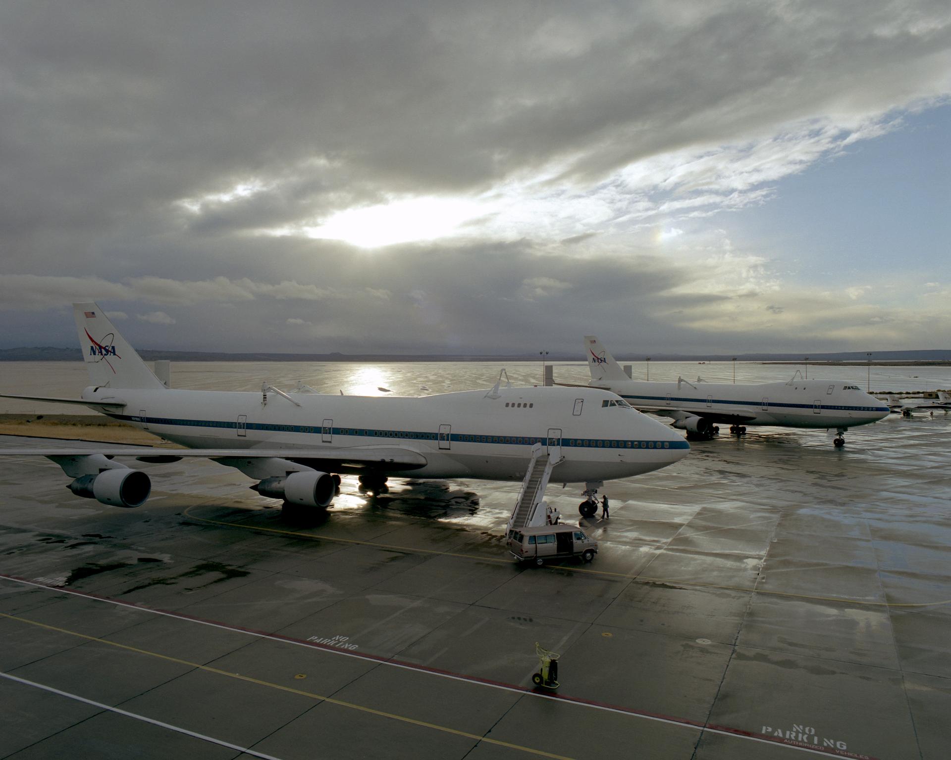The sun begins to break through the clouds over NASA's two 747 Shuttle Carrier Aircraft on the NASA Dryden ramp after a rain shower in February 2001.