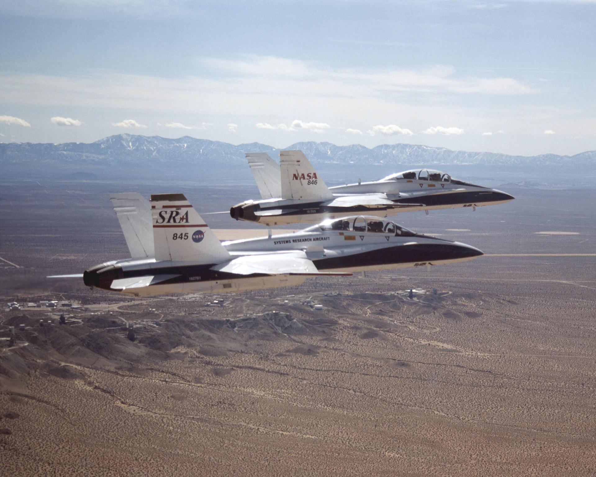 Two F/A-18B aircraft involved in the AFF program return to base in close formation with the autonomous function disengaged.